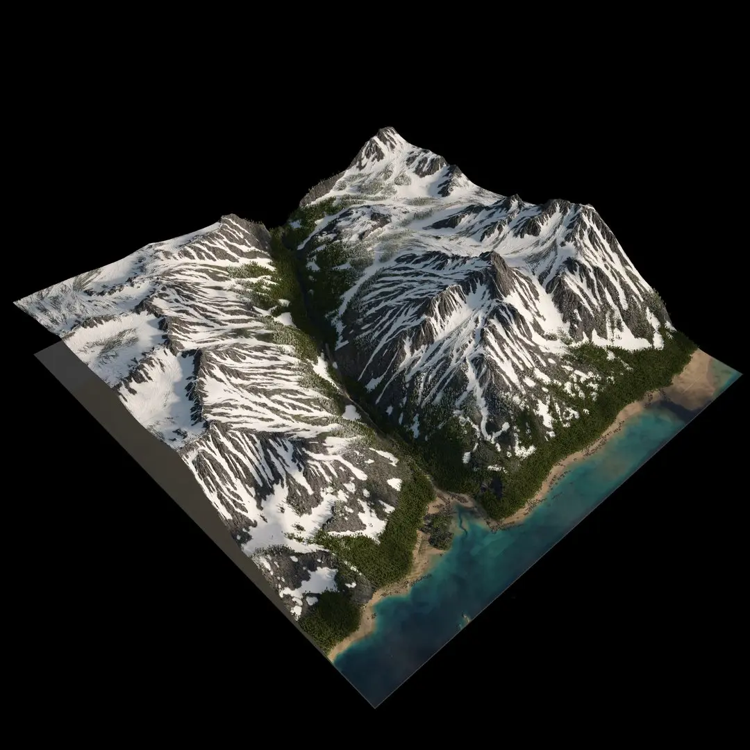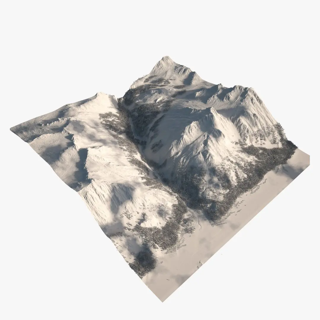 When you open the file you will see a preview mountain. This isn't the render version, it is a preview version used for Forest Pack distribution. The render version is a flat plane below that surface with a 8K Displacement map applied.