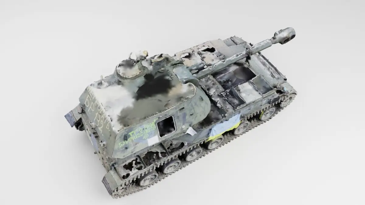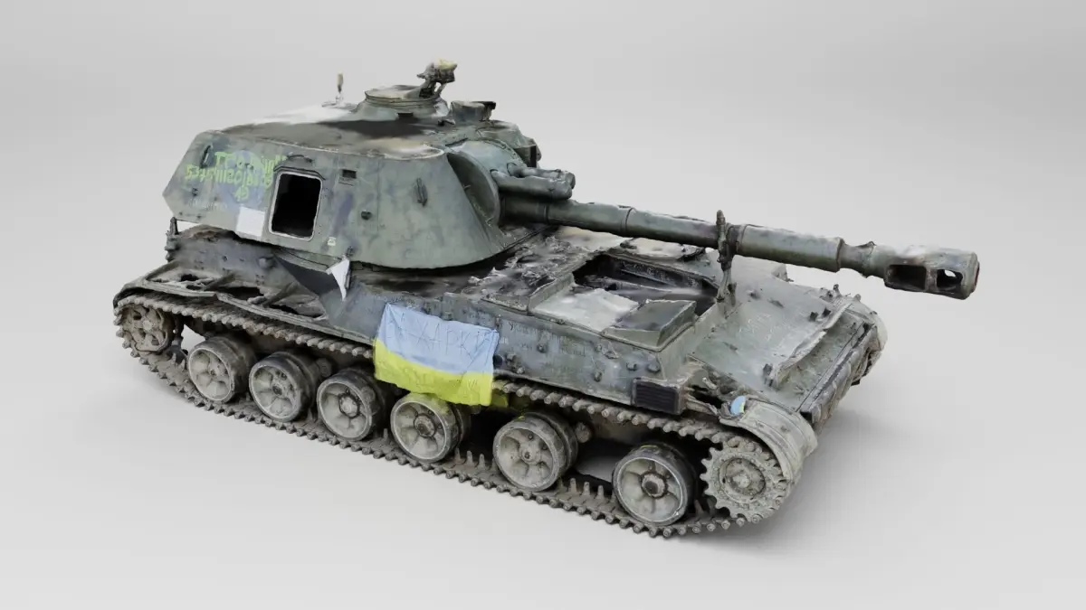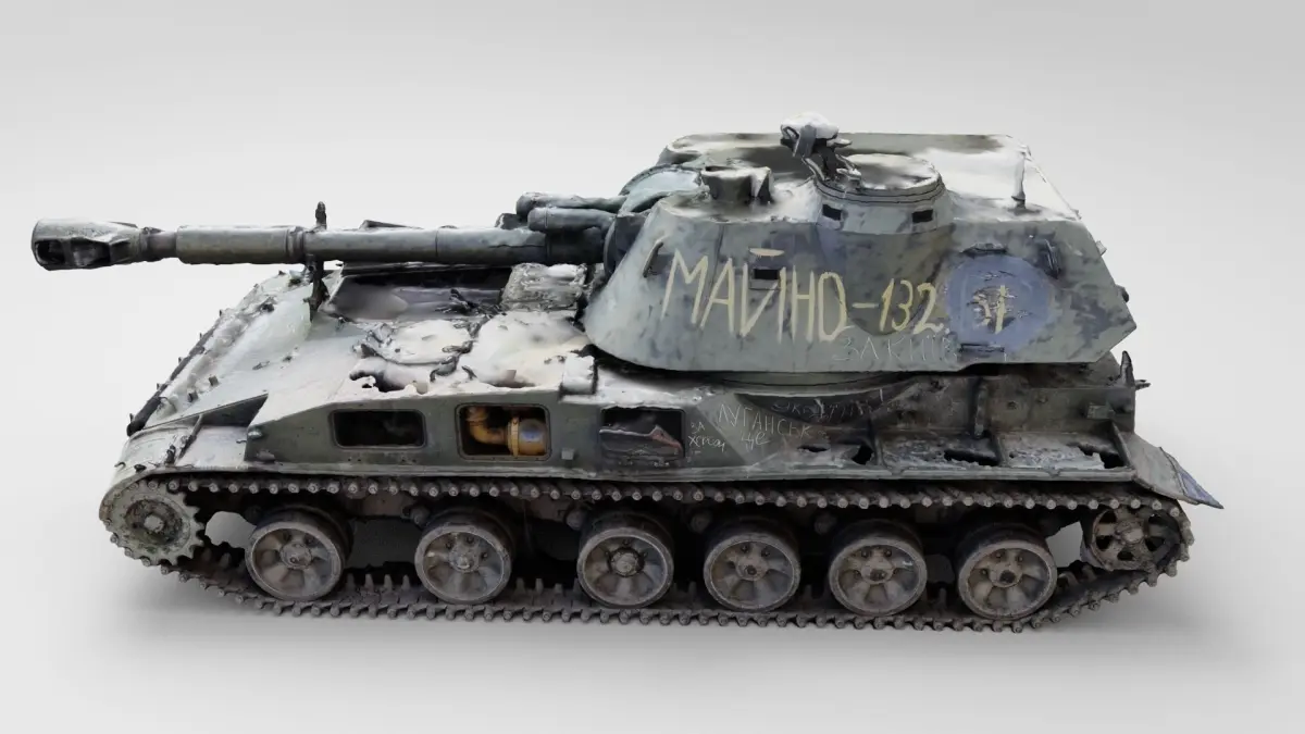 Russian SO-152 2S3 Akatsiya self-propelled gun destroyed by Ukrainian army during russian occupation of Ukraine, 2022 war in Ukraine. Please support Ukrainian artists.