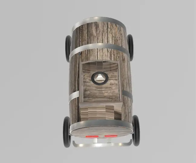 Soapbox car, made out of a wooden barrell and some parts of metal, has a simple suspension, wooden wheels covered with a plastic hose, hand-made motor-less vehicle, its a racing kart