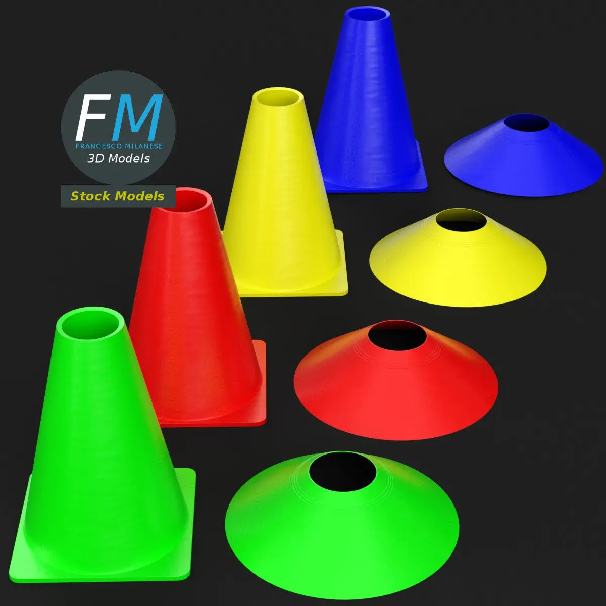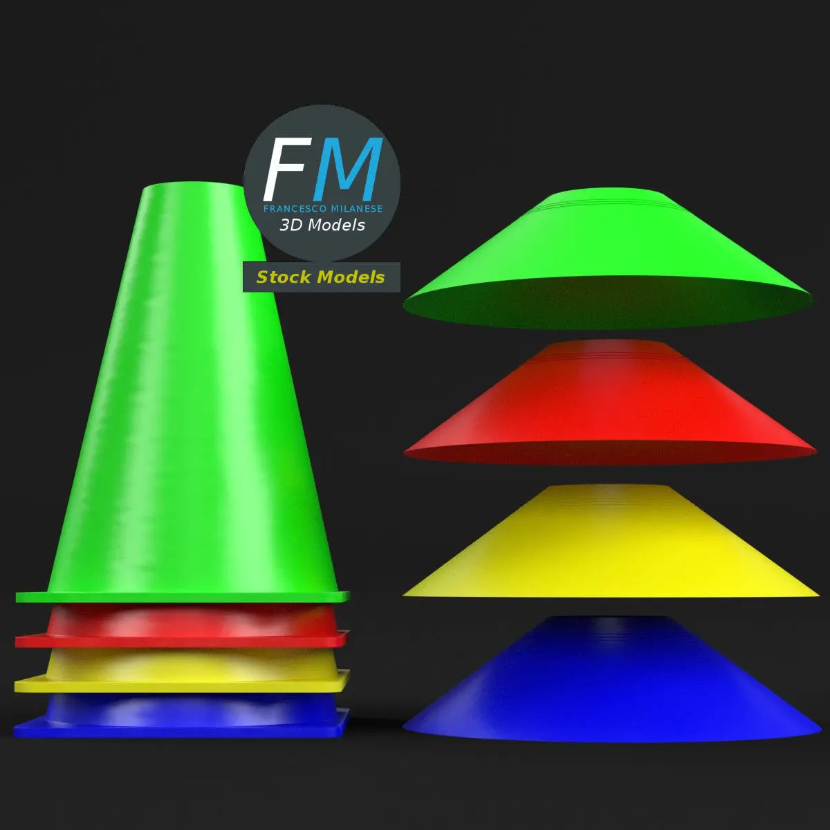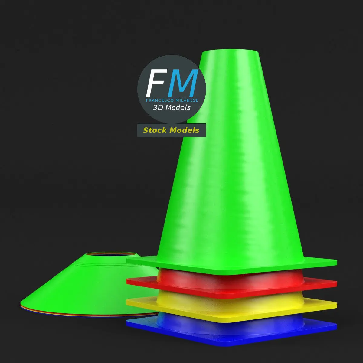 Soccer cones training equipment 3D Models. 8 individual objects sharing the same non overlapping UV Layout map, Material and PBR Textures set. Production-ready 3D Model, with PBR materials, textures, non overlapping UV Layout map provided in the package.Quads only geometries (no tris/ngons).Easily customizable: UV unwrapped geometries; UV Layout maps provided in the package as png with alpha images.Each Object, Material or Texture provided in the package has a unique, meaningful name.Made in Blender 3.6.1 LTS with Cycles Principled BSDF PBR shader with textures included (Eevee compatible), then exported to OBJ and FBX; materials and textures made in Substance Painter (Adobe 3D Painter), exported for PBR, Cycles, V-Ray, Unity, Unreal.PROMO IMAGES: the first image has been rendered in Cycles for Blender; in particular, you can find 11+ promo images in this description: