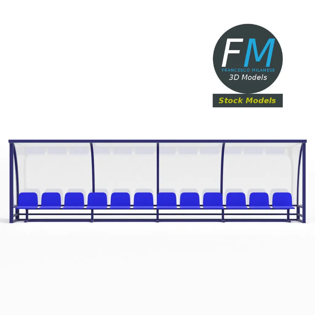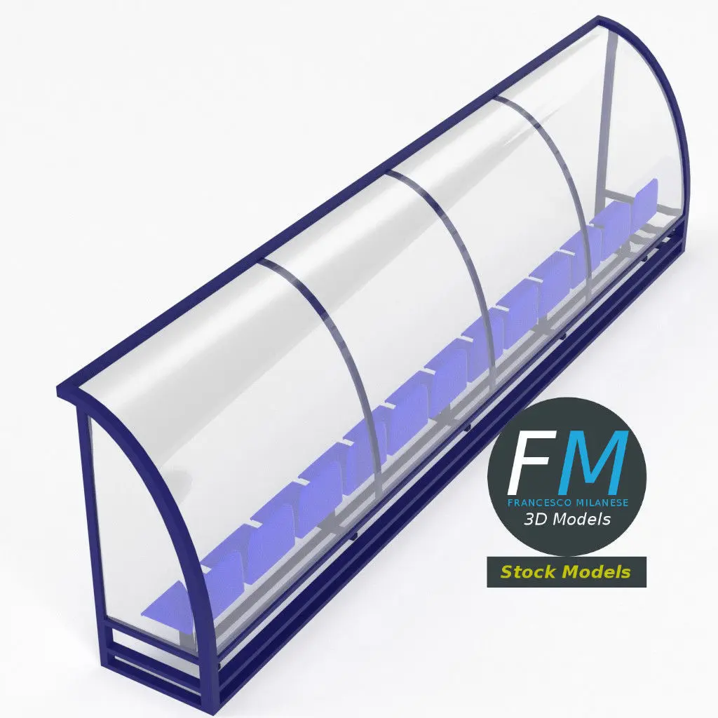 Soccer reserve bench 3D Model. 2 individual objects (frame, glass), each one with its own non overlapping UV Layout map, Material and PBR Textures set. Production-ready 3D Model, with PBR materials, textures, non overlapping UV Layout map provided in the package.