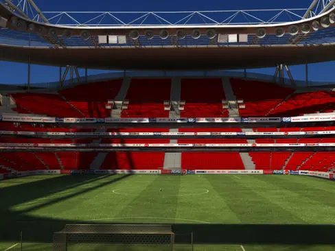 Complete high detail soccer stadium, exterior and interior with tribunes, seats, display, roof construction, advertisement-boards, goals, corner flags and ball.