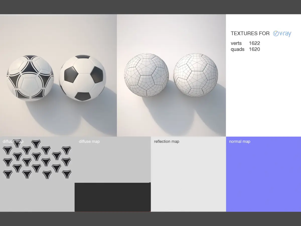 you get 2 soccerballs with PBR flattened textures for VRay Standard Material (VRayMtl) for 3ds max and maya.