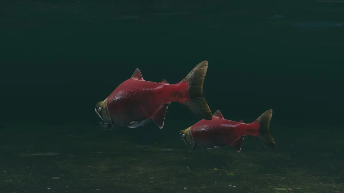 The sockeye salmon (Oncorhynchus nerka), also called red salmon, kokanee salmon, or blueback salmon, is an anadromous species of salmon found in the Northern Pacific Ocean and rivers discharging into it. This species is a Pacific salmon that is primarily red in hue during spawning. They can grow up to 84 cm (2 ft 9 in) in length and weigh 2.3 to 7 kg (5–15 lb). Juveniles remain in freshwater until they are ready to migrate to the ocean, over distances of up to 1,600 km (1,000 mi). Their diet consists primarily of zooplankton. Sockeye salmon are semelparous, dying after they spawn. Some populations, referred to as kokanee, do not migrate to the ocean and live their entire lives in freshwater.