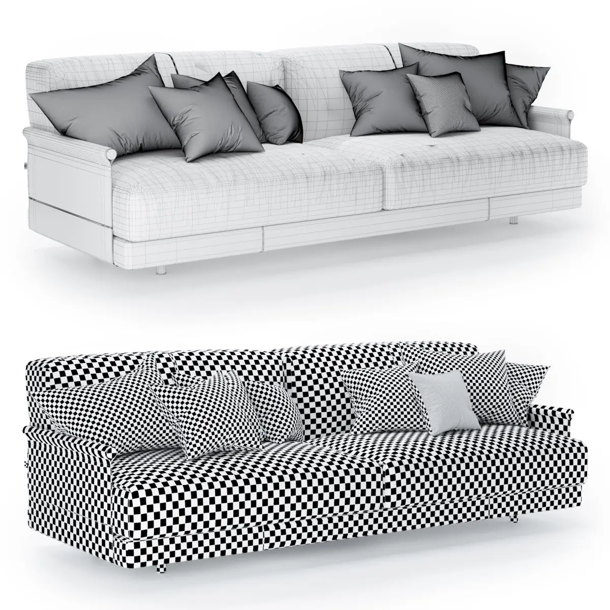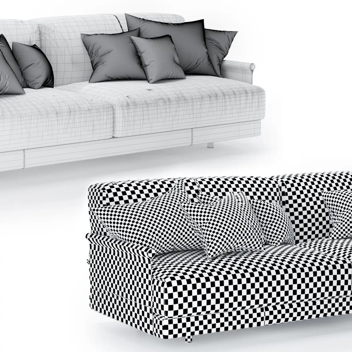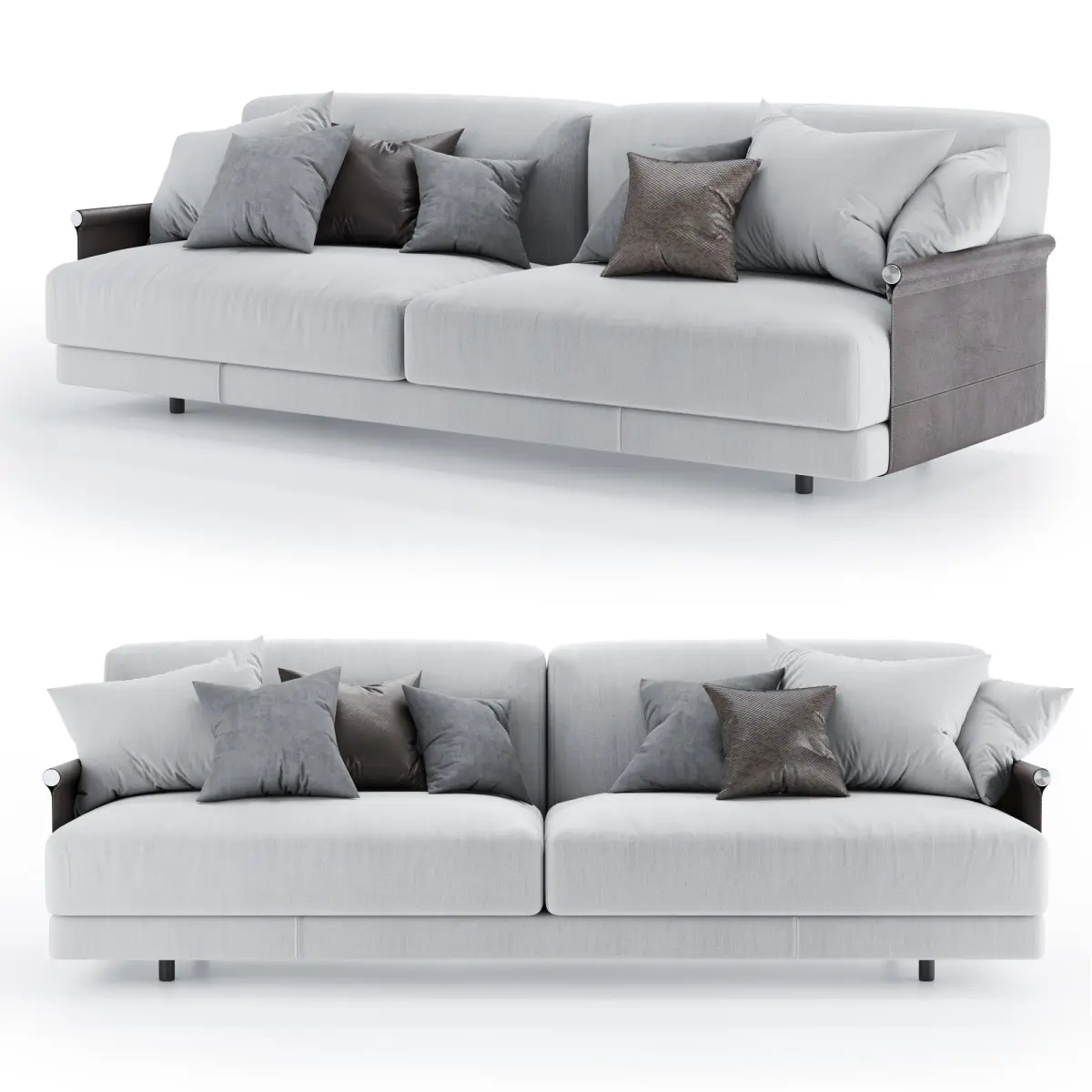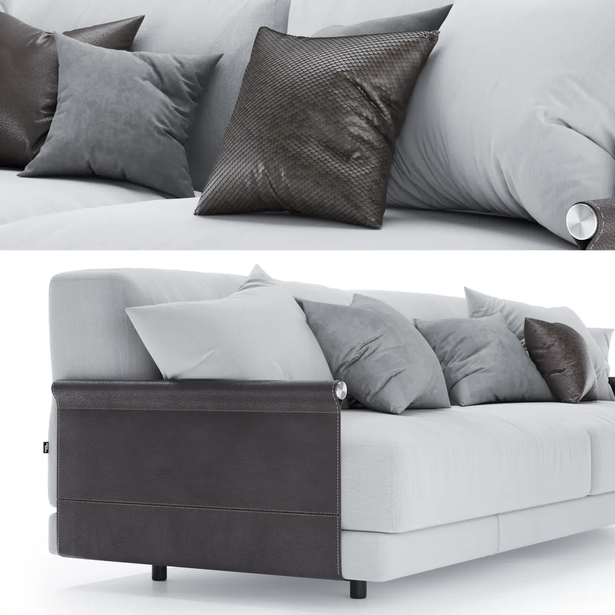 Sofa in gray fabric with brown leather inserts and chrome details. Decorated with pillows of different sizes and materials. Pillows in light grey, dark gray fabric and brown leather.