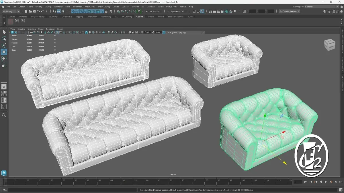 3D Sofa and Loveseat combo.Model files are available as LODs with one high poly and one low poly LOD each, or individual high and low rez model files. They are available as Maya .ma, .fbx, .obj, .usd, and .stl