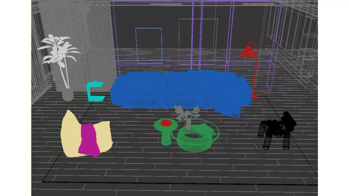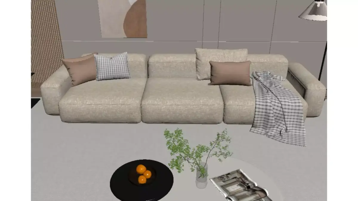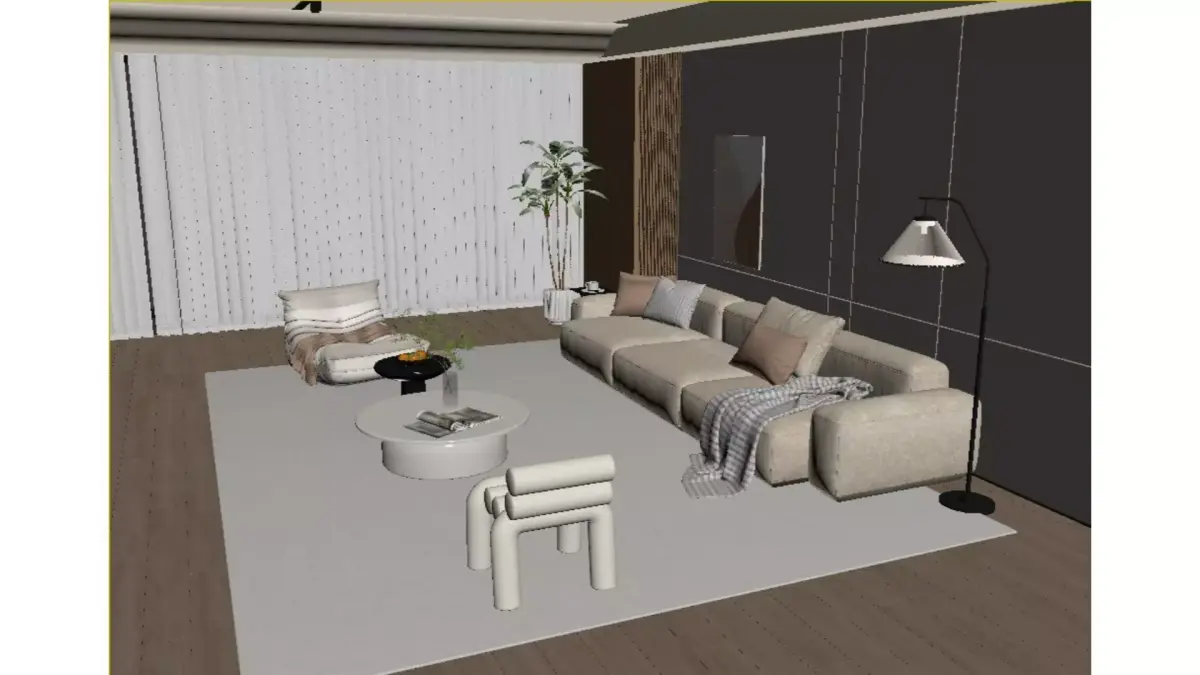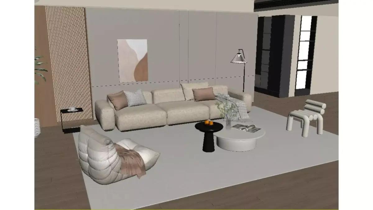 This is a modern minimalist living space, primarily featuring beige, light apricot, and natural wood tones, creating a soft, relaxed, and sophisticated ambiance.Core furniture:The main piece is a set of beige modular sofas, paired with light brown and plaid cushions, with a matching plaid blanket draped on one side. The rounded, full lines combine comfort with a sense of design.On the left is a creamy-colored recliner sofa, casually draped with a caramel-colored knit blanket, exuding a lazy yet cozy ambiance.In the center is a round white coffee table, flanked by a small dark gray round side table adorned with fruits, magazines, and a transparent vase filled with greenery, exuding refined details.In the foreground stands a uniquely designed white tubular art chair, adding a modern artistic touch to the space.Soft Furnishings and Atmosphere:A large area of light beige carpet is laid over the light wood-toned floor, softening the rigidity of the space.The background wall features light gray vertical-textured panels paired with a minimalist abstract painting, enhancing the overall texture.On the right side stands a black metal floor lamp with a beige fabric lampshade, casting a soft glow.Beside the window is a set of white vertical blinds paired with a tall potted green plant, adding a sense of breathability to the space.The overall design is clean and crisp, devoid of unnecessary embellishments. Through the softness of materials and the unity of colors, it creates a modern home scene that is both comfortable and stylish.