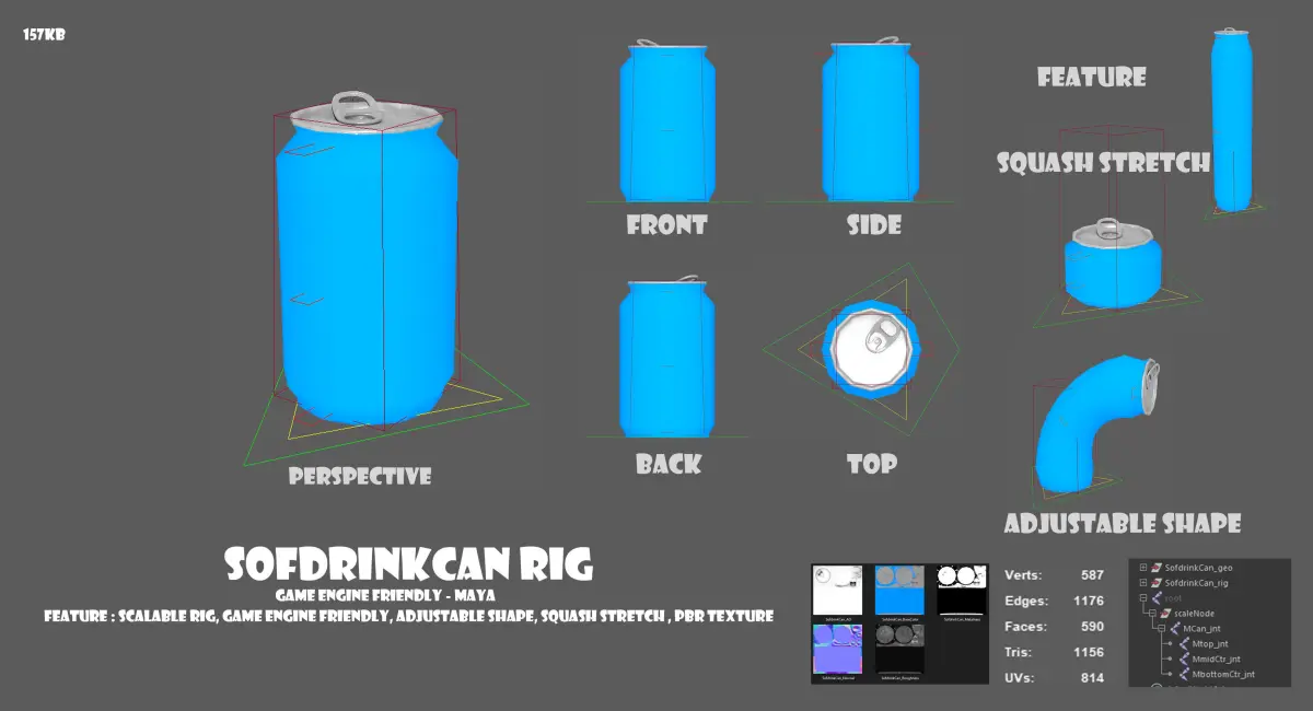 Soft Drink Can Rig for Maya and Game Engine (Unity, Unreal Engine, etc). The model have texture BaseColor, Normal, AO, Metalness, Roughness.