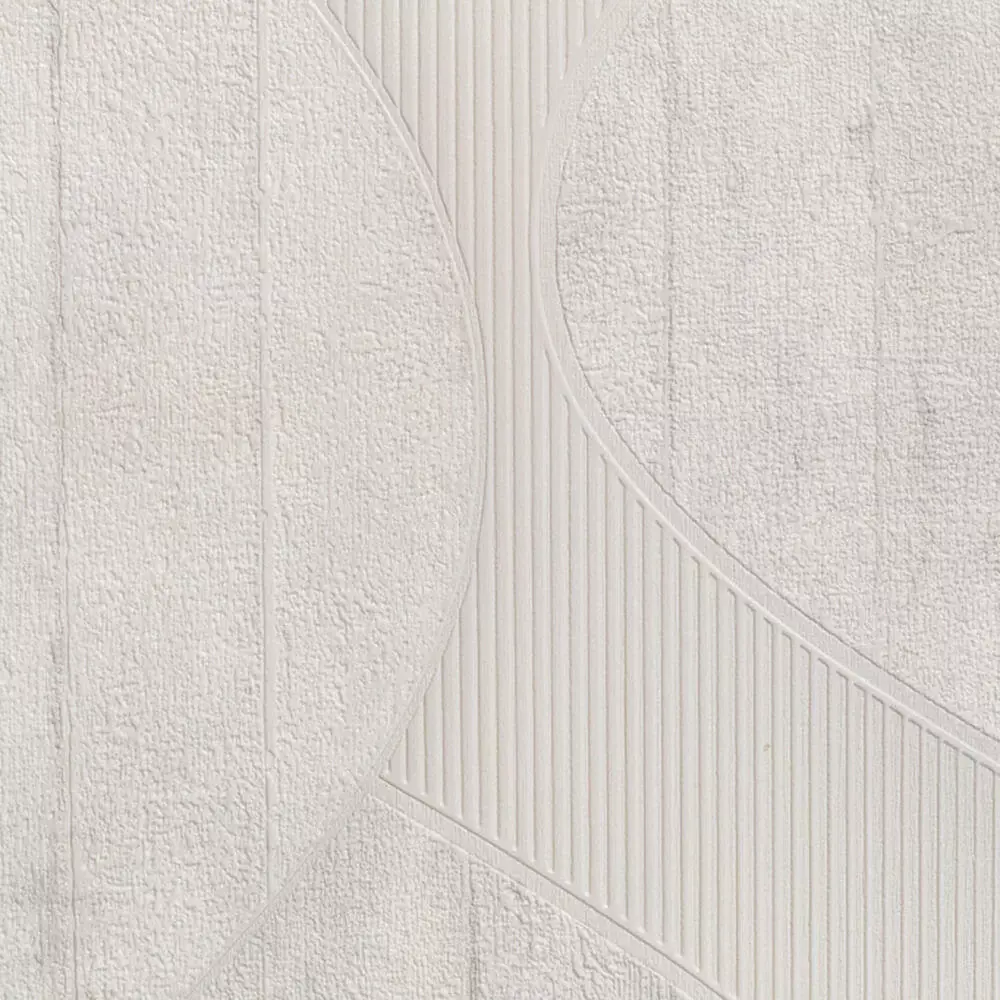 OverviewA subtle geometric wallpaper texture featuring overlapping ovals and bands etched into a warm white, stone‑like ground. Fine vertical ribbing contrasts with softly pebbled plaster areas to create depth without visual noise, making it ideal for living rooms, media walls, corridors, and minimalist interiors. The seamless repeat keeps the pattern calm and continuous across large surfaces.