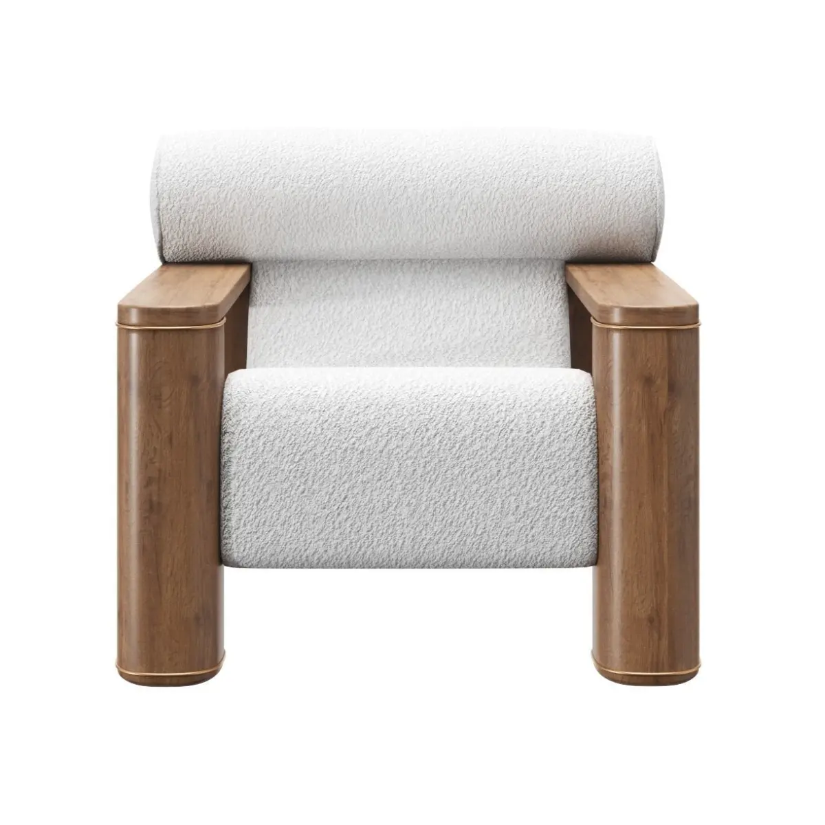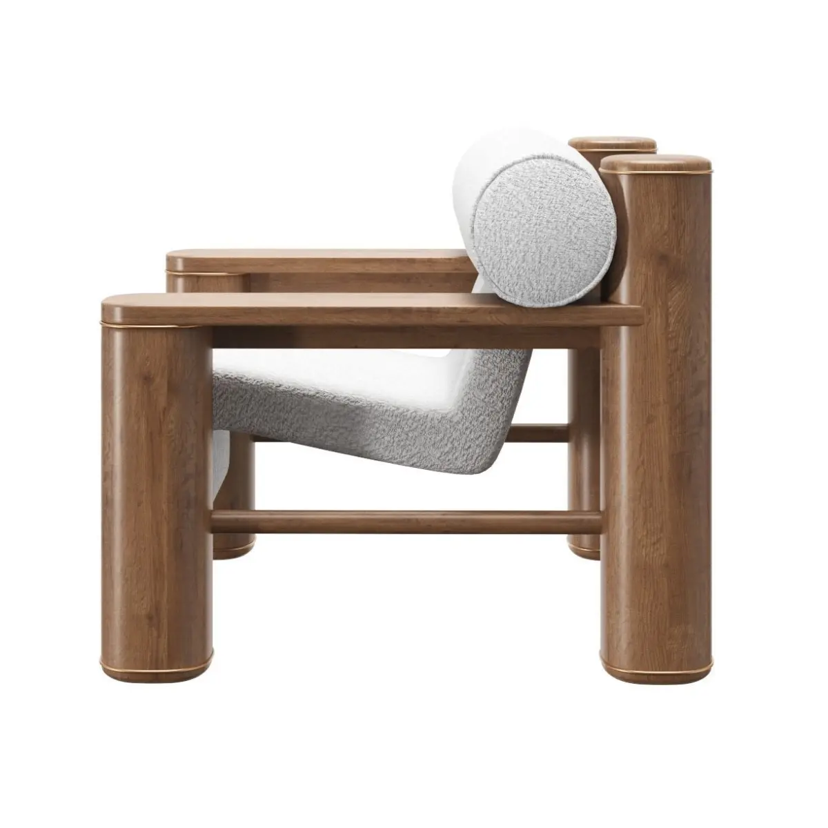 The model is fully textures, Oak wood, boucle fabric and brass accents.