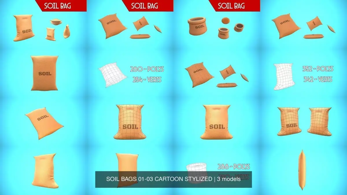 Low poly textured model of SOIL BAGS 01-03 CARTOON STYLIZED Well-textured and ready for Virtual Reality (VR), Augmented Reality (AR), games and other real-time apps for handheld devices.