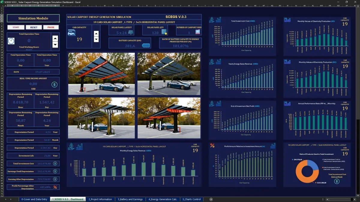 • Investment Costs, Depreciation and Production Simulation of the Design for 19 Vehicle, Battery Off-Grid System and Vertical Layout and 5x24=120 Solar Panels can be Monitored.