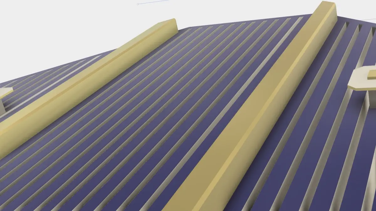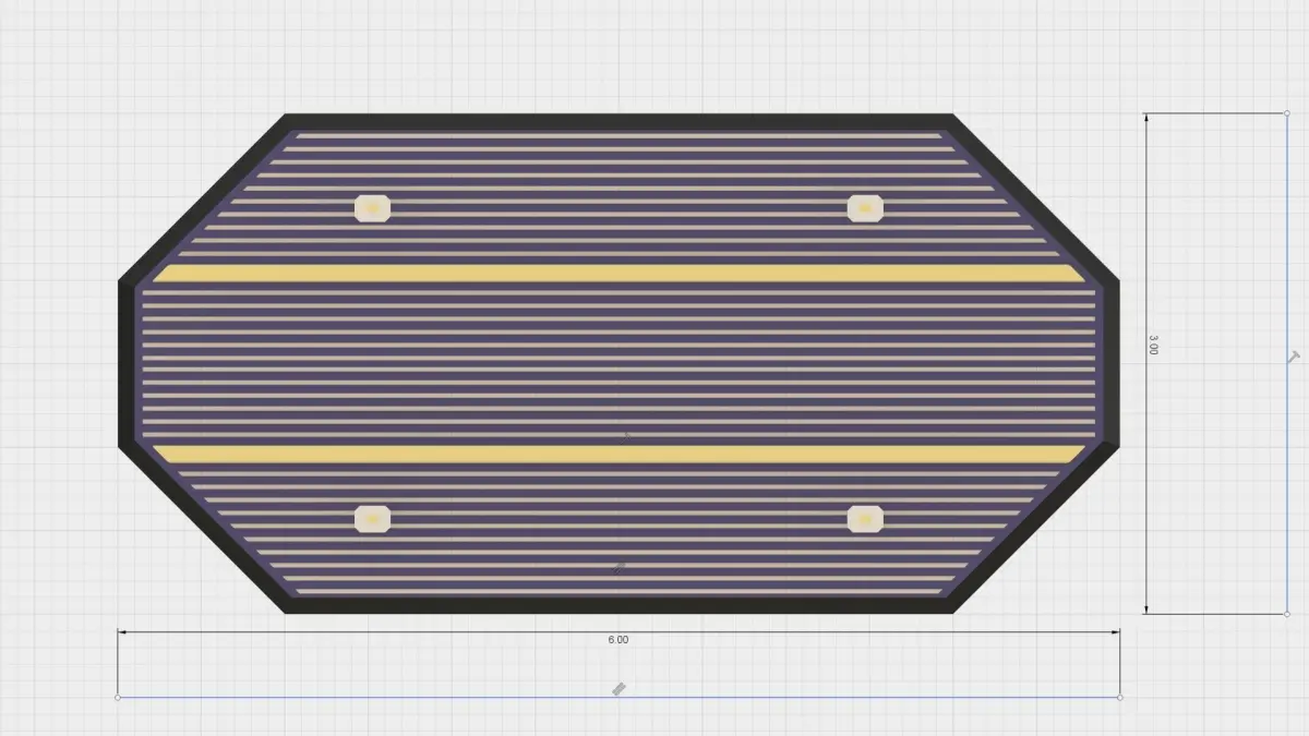 This is a model of a single photovoltaic cell. The dimensions of this standard sized cell are 6 cm x 3 cm x 0.40 cm. This cell can be used to populate solar modules and arrays. The cell itself is crystalline silicone, with gold busbars, embossed on a black silicon wafer. Smaller electrical contacts (fingers) are in an array of conduits along the long axis of the cell. It has a total light collecting area of 9.335 cm^2.