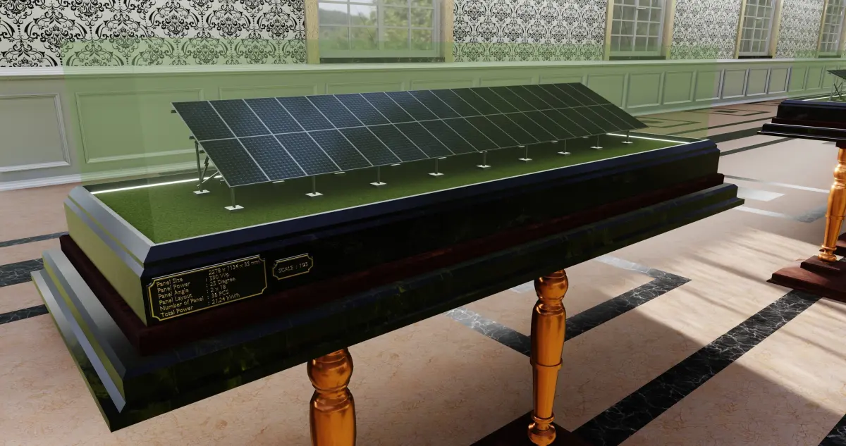 Table With 2x8 PanelsIt is the Miniature Diaroma Model of the Table, which provides 9.44 kW (DC) Hourly Power Generation with 16 Solar Panels.
