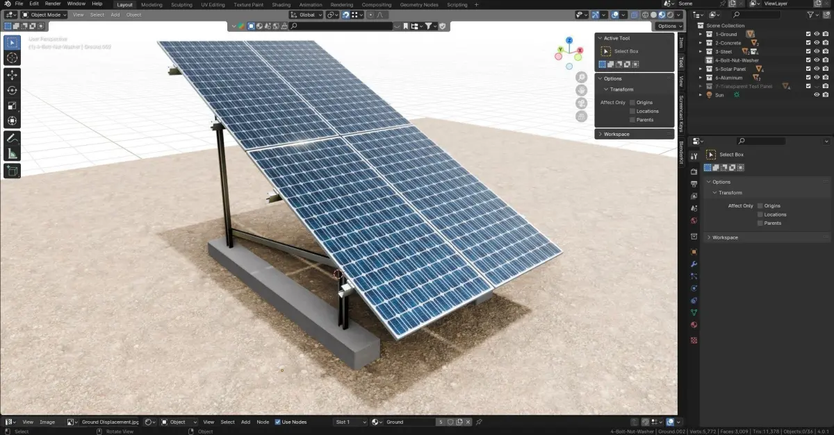 1-Irrigation Solar Power 2HP-2.2kw-2x2 TablePrepared With BLENDER Version 4.0.1Polygons : 3009Vertices : 5772Objects : 36