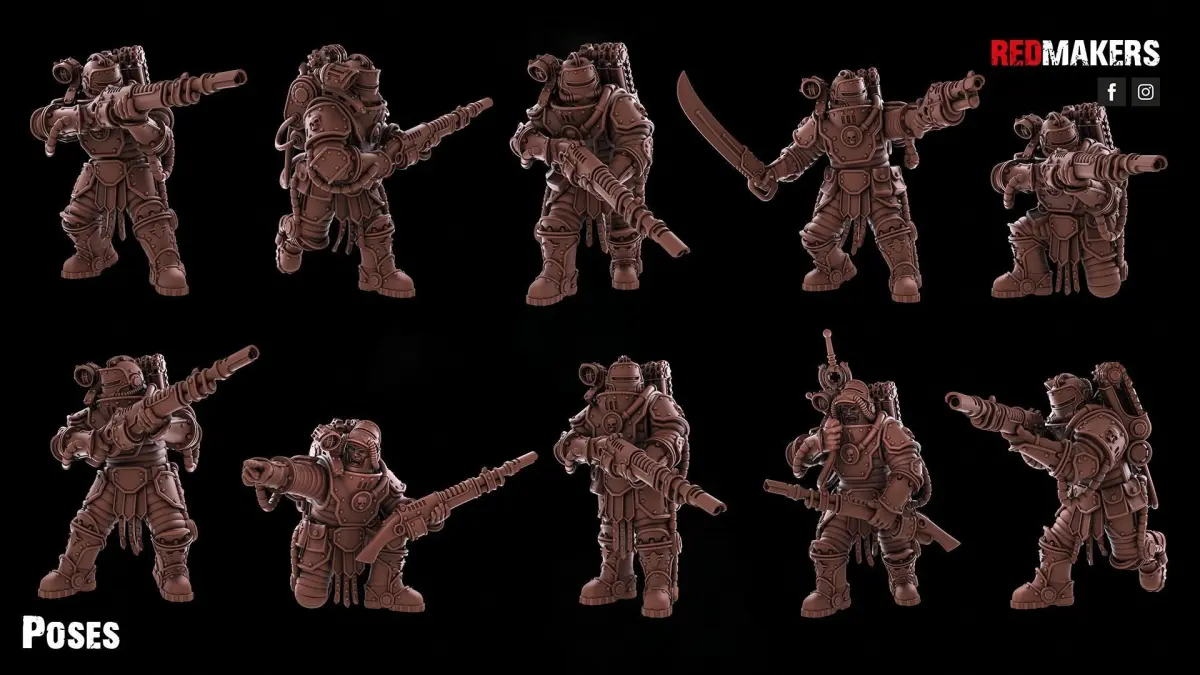 The infantry squad of the Solar Guard consists of 8 soldiers, a radio operator and a sergeant. Each warrior has several weapon options. Scaled for 28 mm tabletop.