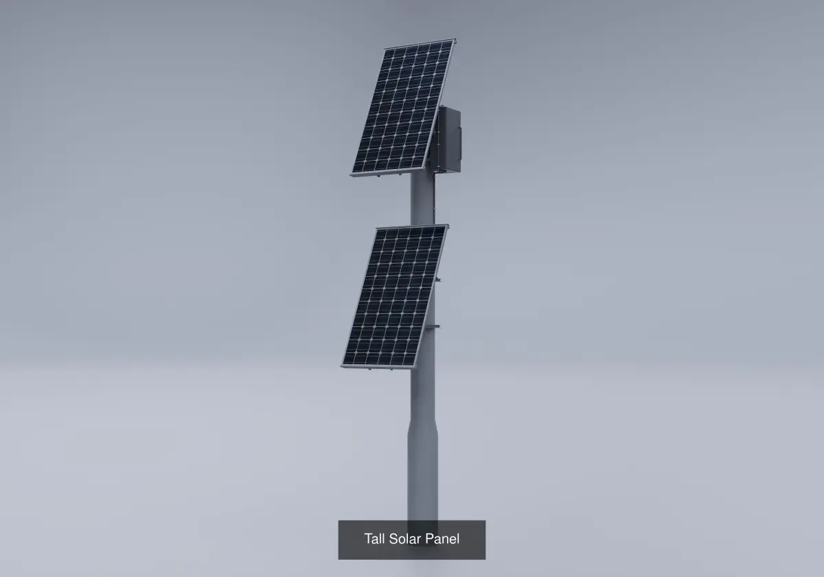 A large 45° fixed solar panel with metal frame on a concrete base and a tall fixed solar panel with post and mounts.