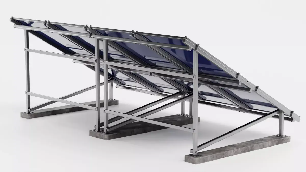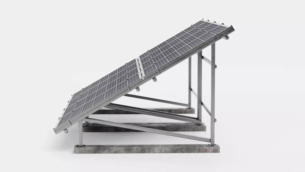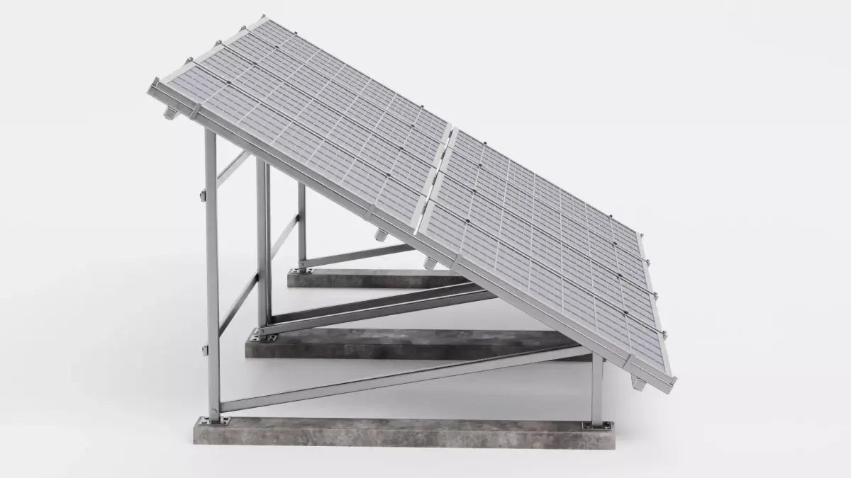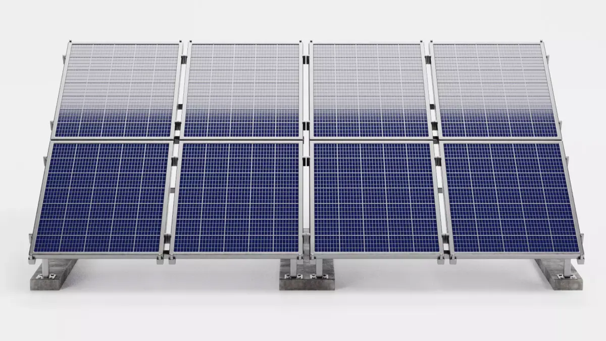 A highly detailed 3D asset featuring two polycrystalline solar panel arrays on separate metal frames with modeled concrete footings. Each panel reflects light realistically and shows intricate cell textures, while the dual-array configuration offers a comprehensive representation of large-scale freestanding photovoltaic installations. Perfect for architectural visualization, renewable energy projects, or environmental simulations, this model delivers ready-to-render realism and flexibility.