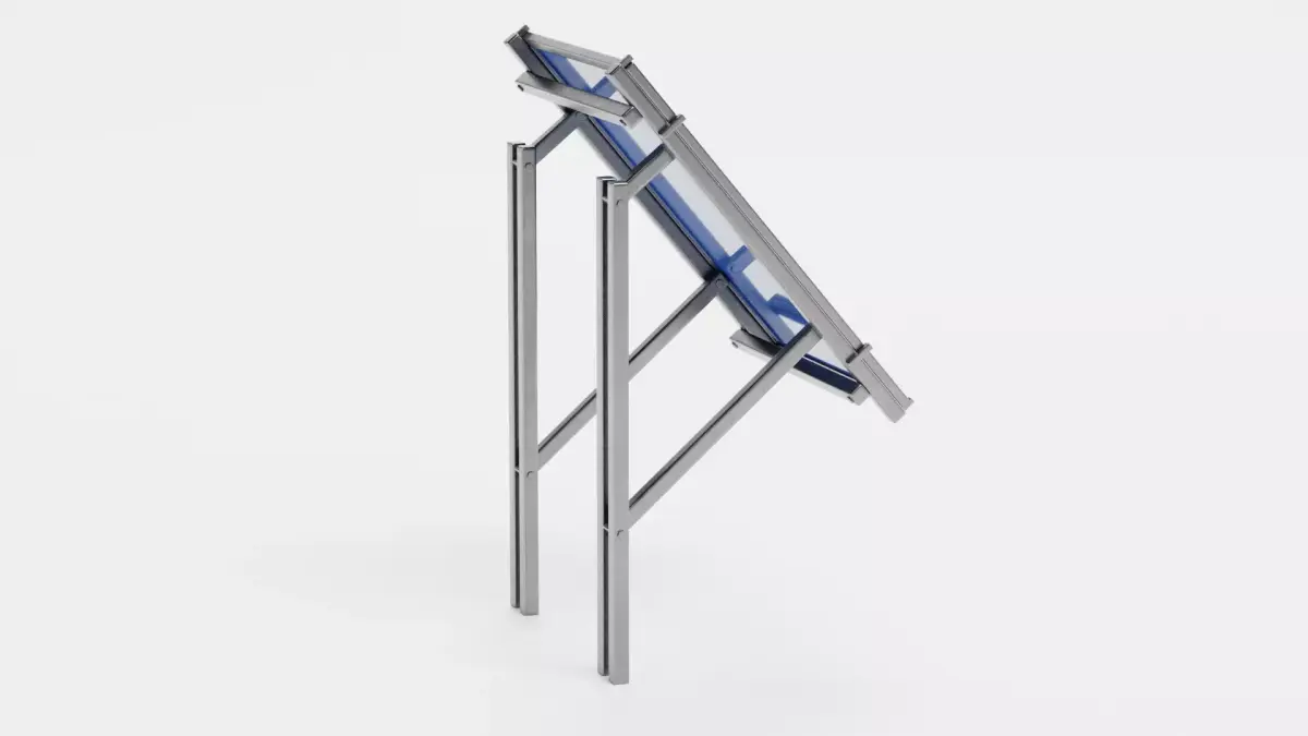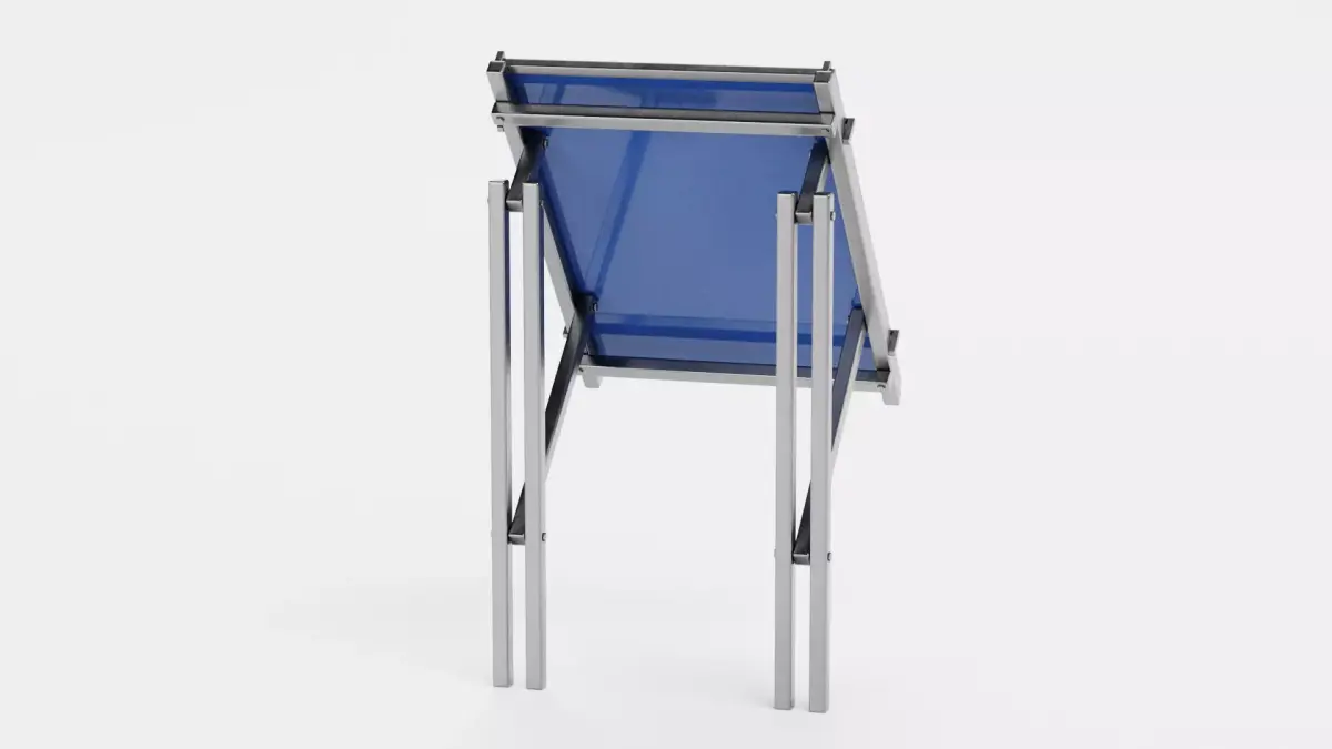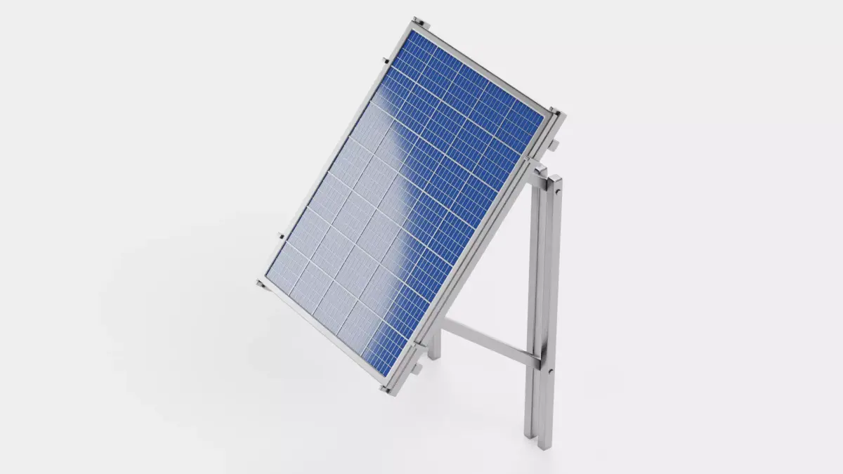 A detailed 3D model of a single polycrystalline solar panel mounted on a tilted metal bracket. The design emphasizes accurate cell layout, realistic reflective surfaces, and precise panel geometry. The bracket replicating real-world installation angles, and can be integrated as a standalone element or combined into modular photovoltaic arrays. This versatile model is suitable for architectural visualizations, renewable energy simulations, and product rendering projects.