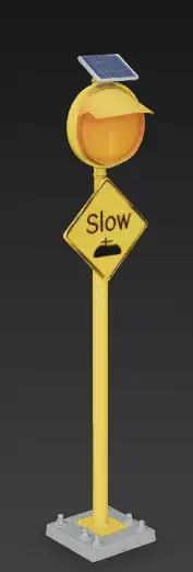 The Overall Concept This asset is a high-visibility warning sign designed to alert drivers to hazards ahead. It combines a standard road sign with a powered flashing beacon, making it perfect for placing near school zones, crosswalks, or speed bumps in your game.