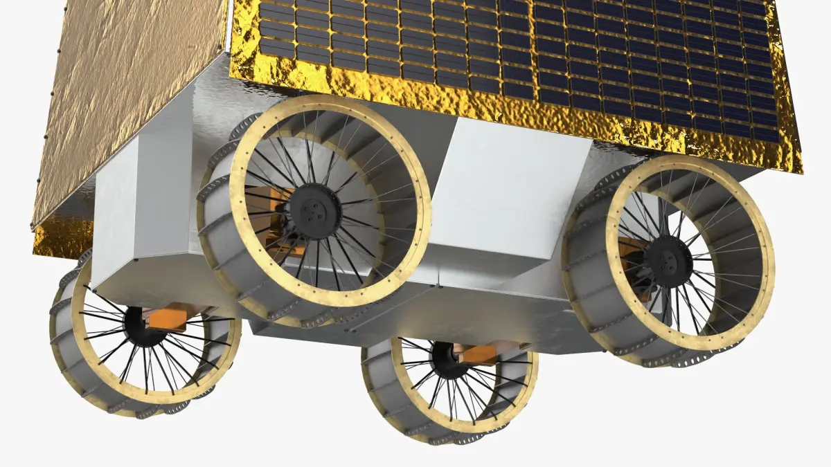 It features solar arrays, articulated wheels, scientific instruments, and onboard navigation systems for independent extraterrestrial exploration. The model represents a technologically advanced unmanned rover designed for operation on the Moon’s surface.