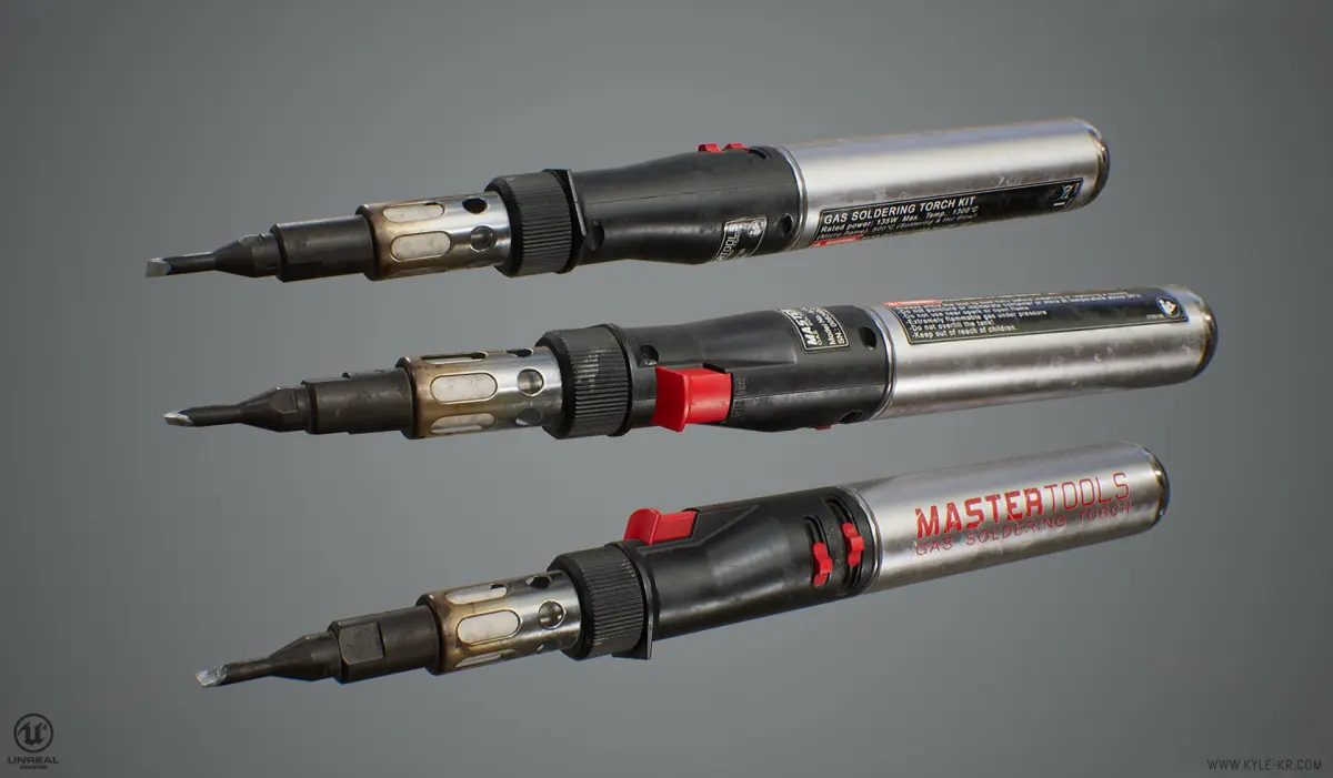 Can be used as torch, lighter or as soldering tool (Soldering iron tip is detachable)The 3 red switches(igniter, lock, intensity) can slide and move to facilitate realistic interaction