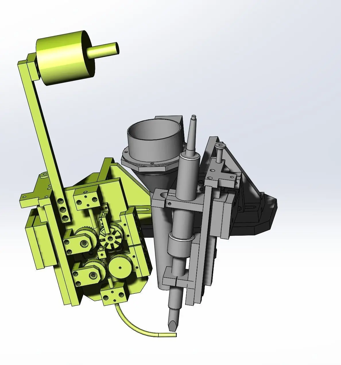 Soldering welding mechanism, this mechanism can be divided into wire conveying mechanism and welding torch connecting mechanism, Sewerage mechanism by motor driven gear will wire into the guide roll, welding torch down welding, complete the automatic soldering on the action mechanism is simple, high applicabilityThemechanism includes: