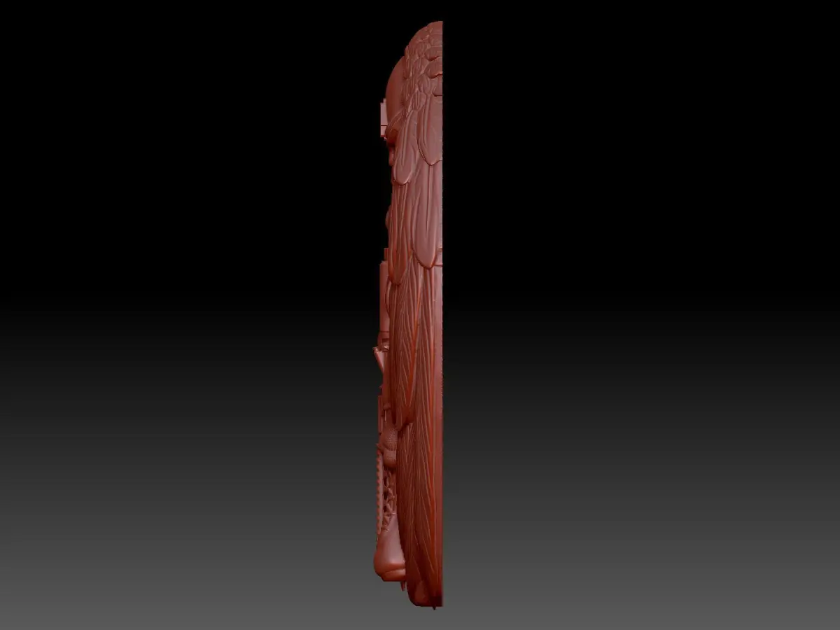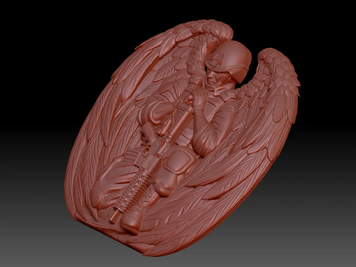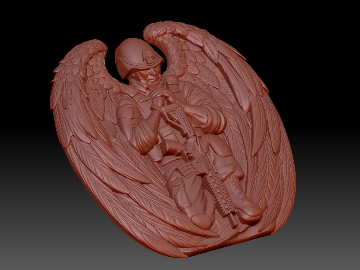 3D model of the Soldier bas-relief. The image shows a soldier in uniform kneeling. Wings are behind his back. The project is suitable for 3D printing and CNC machining.