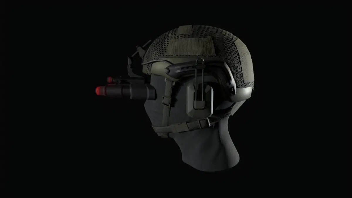A modern military helmet with a movable night vision device using highly detailed PBR 4k textures.
