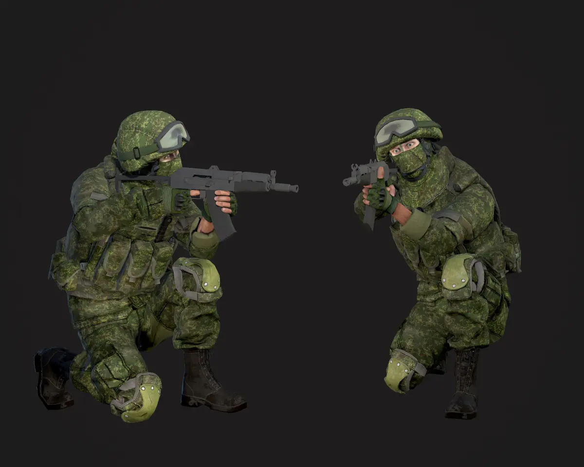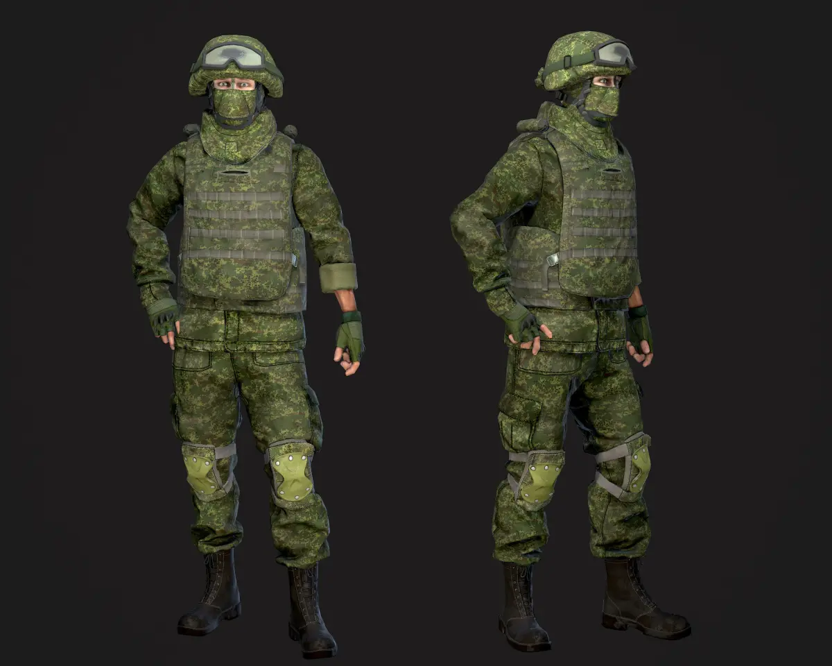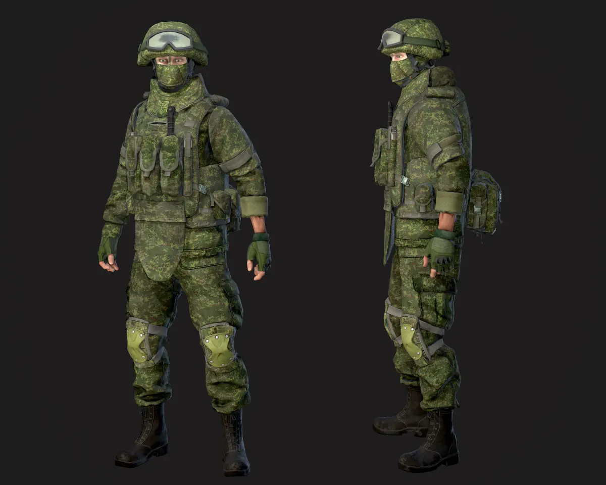 High-quality low-poly 3D model of a modern infantry soldier equipped with the Russian Ratnik gear set. This model is optimized for real-time applications such as video games, simulations, VR/AR.
