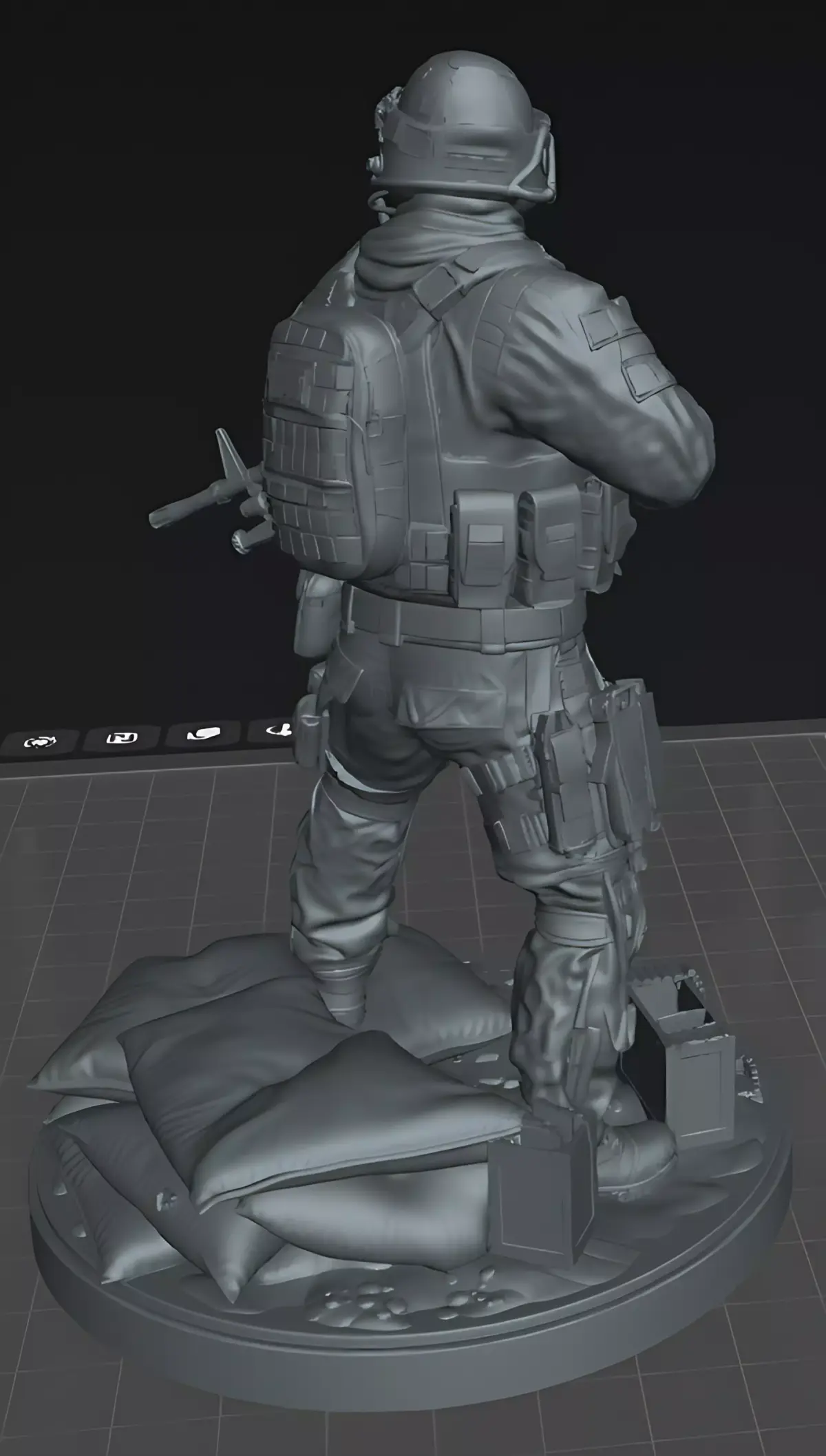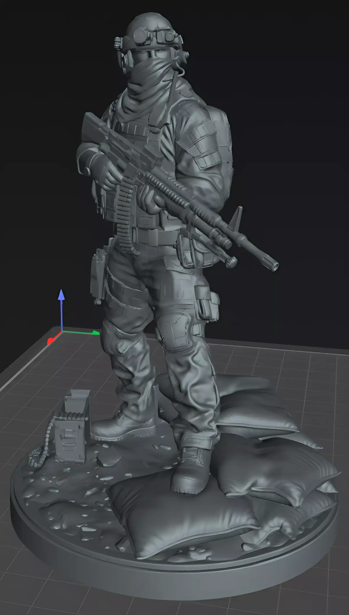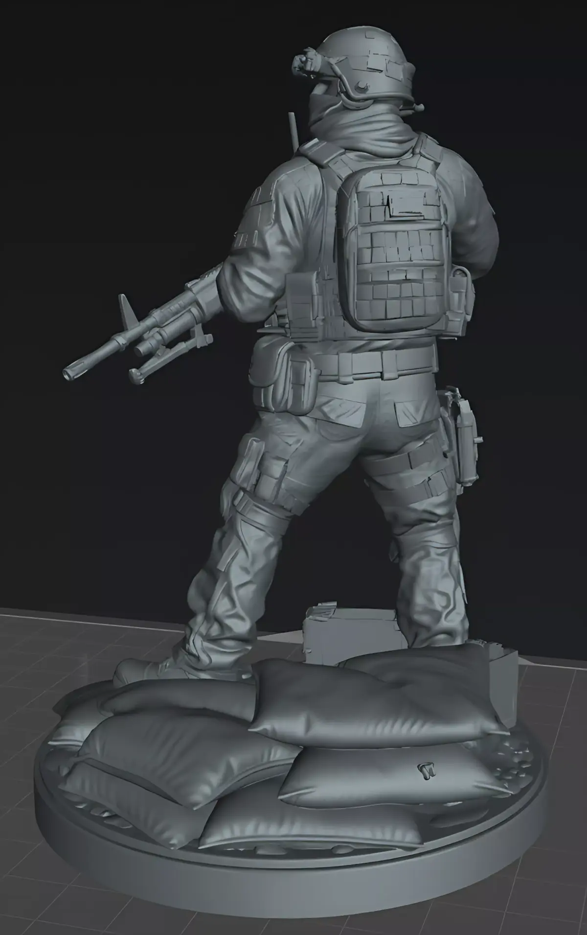 The base includes environmental elements such as sandbags, ammunition box, and scattered debris, adding realism and making the model ideal for military dioramas, collectors, miniature painters, and tabletop wargaming.