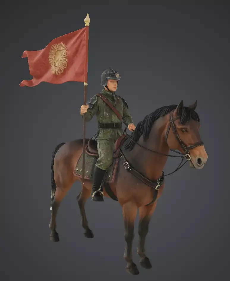 this 3cd modle dipics of a soldier holding his flag. On the back of his hoarse.
