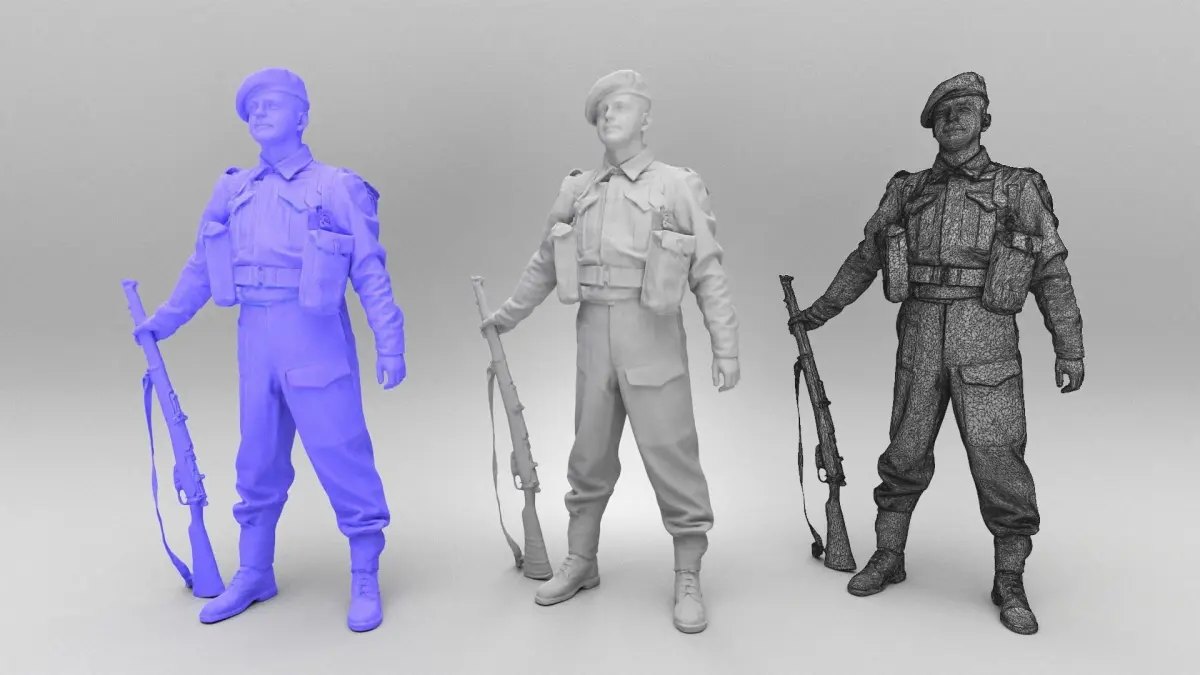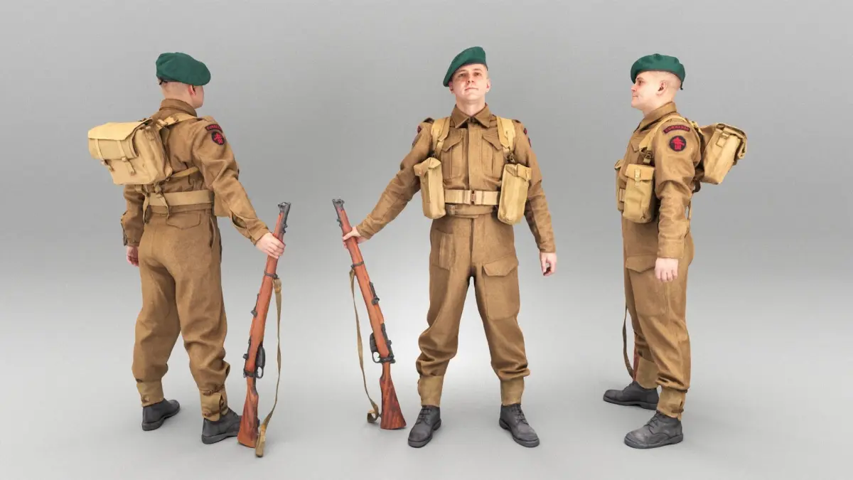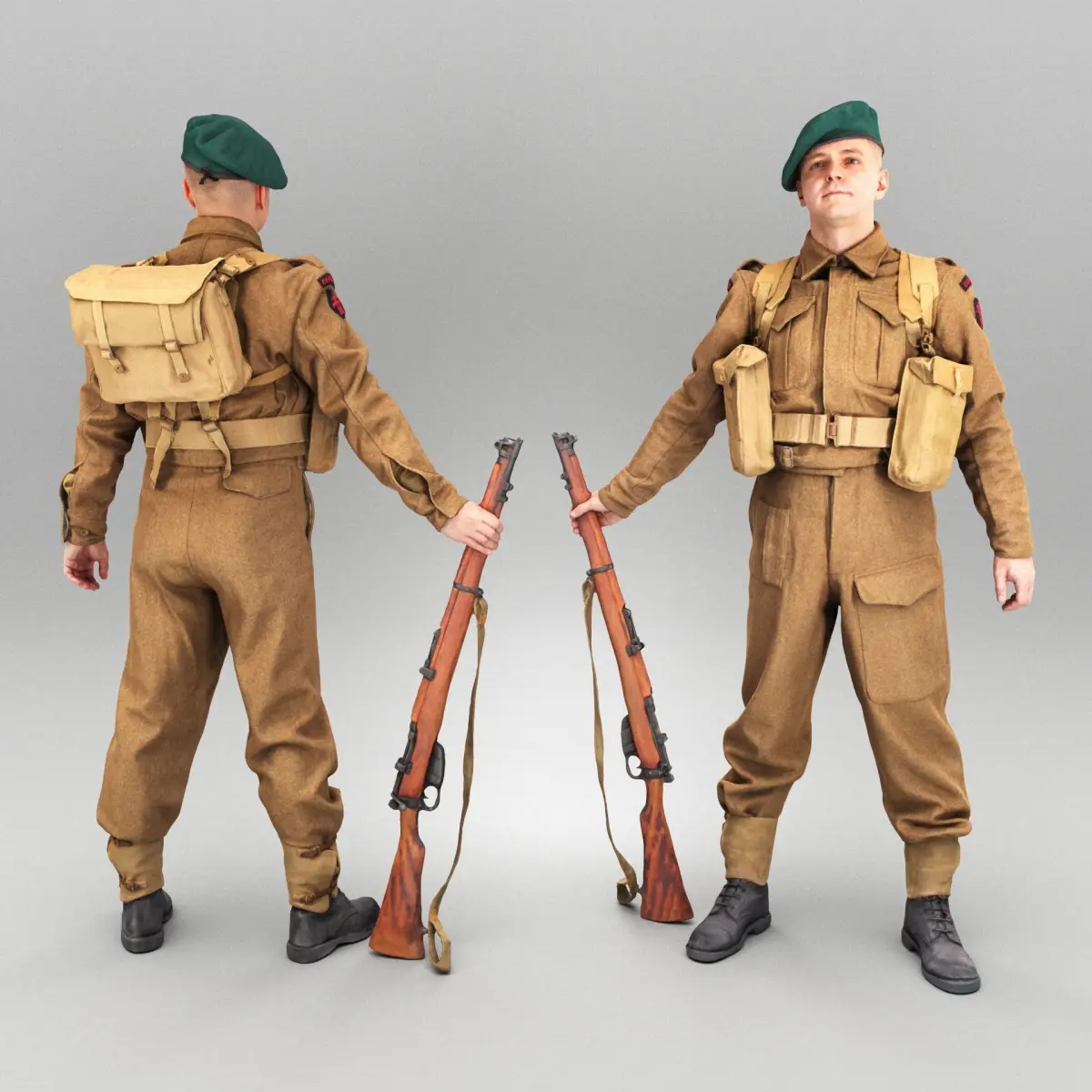 This is a true human size and detailed model of a British infantry character from 1940s. All props and suit are original. The model is captured in casual pose to be perfectly matching to variety of architectural visualization, background character, World War 2 reconstruction, performance, VR/AR content, etc.