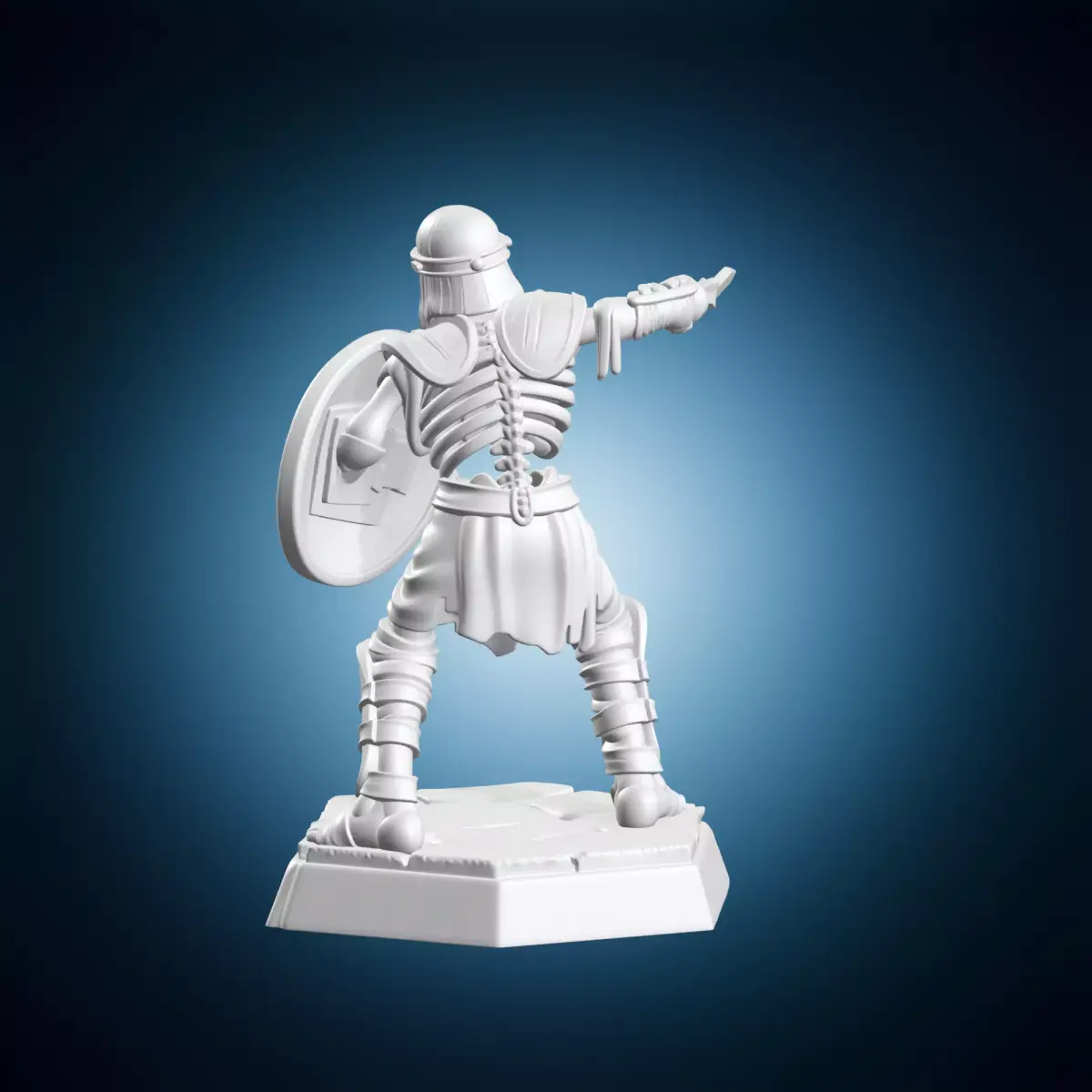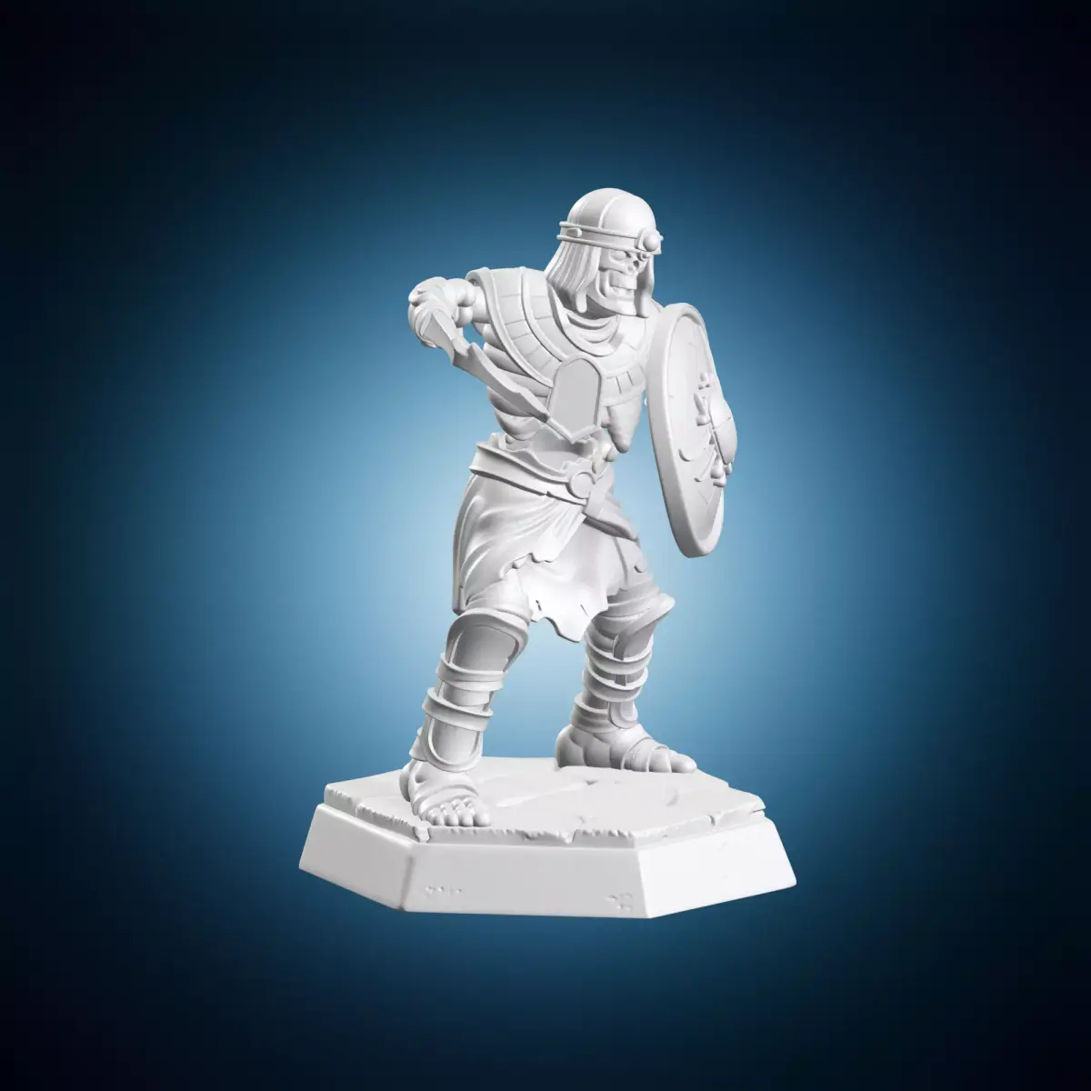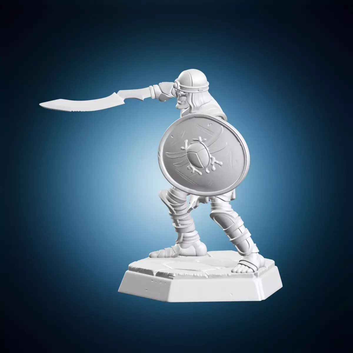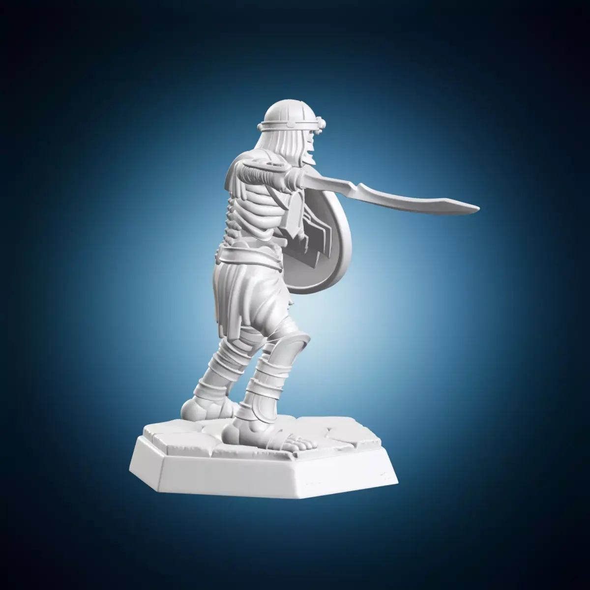 A detailed 3D model of a medieval soldier holding a shield and sword, suitable for use in various projects such as video games, animations, or architectural designs. The miniature is designed to be highly detailed and accurate, making it perfect for artistic purposes or educational content. It can be used as a prop or character model, and its small size makes it ideal for modeling or animation. This 3D model is created using industry-standard software and has been optimized for smooth rendering and minimal polygon count. The shield and sword are intricately detailed, with textures and patterns that add to the overall realism of the model.