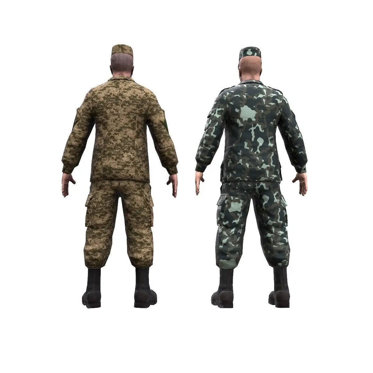 Ukrainian soldiers 2014 and 2017.The Ukrainian army had a 'Dubok' uniform in 2014. In the autumn, a new uniform 'Pixel' was introduced into the troops, which in 2017 is the base in the army.Two low poly characters. All in two characters - total a polys: 8419, total a verts: 7385. Rigged, CAT rigs.PBR-textures 2048x2048, color, normal, AO, metallic, roughness. For 3ds Max there is a color plus AO map (diffuse color).Used in the work 3ds Max, ZBrush, 3D-Coat, xNormal, Substance Painter, Photoshop.Rendering made with Marmoset Toolbag.