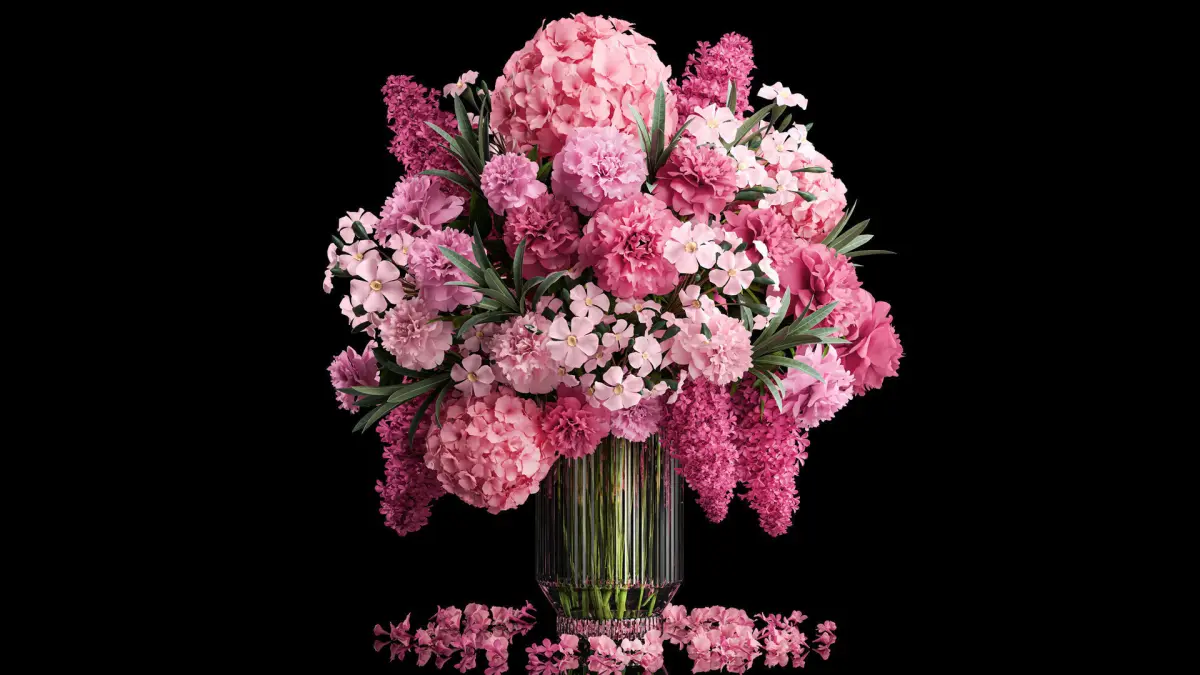 Solemn bouquet of pink flowers vase lilac hydrangea