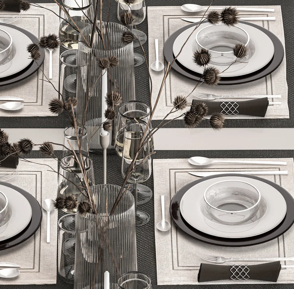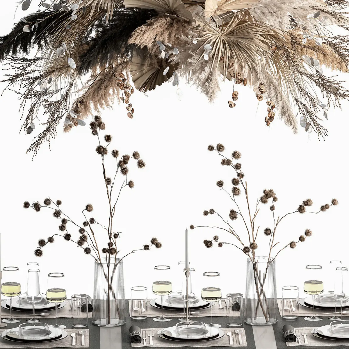 Table setting for 6 persons.Solemn table setting in eco style from dried flowers and natural decor.ZARA HOMEDecorative Bouquet of dry reeds and pampas grass for decoration and interior.Bouquet of bleached dried flowers, hanging installation of dried flowers.Dry branches, dry branches, dried flowers.Eucalyptus, eucalyptus fruits, eucalyptus branches.Dry white reed.Dry reedLunaria - Lunnik, LunariaDried flower, dry grass.glass vaseDry branches, dry thorns, branches with thorns, thorn.Arctium - Great burdock, burdock, burdockdry thornsDried flowers, decor for the table and celebrations.