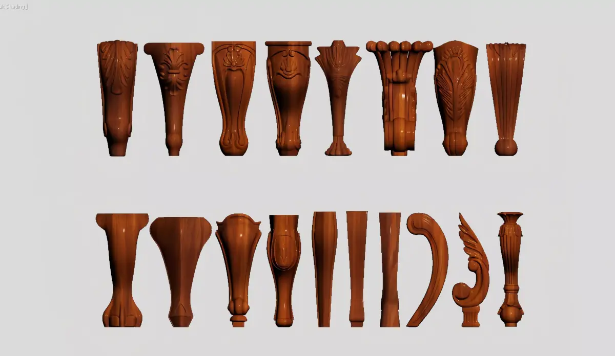 This is a collection of classic European-style furniture legs made of solid wood, featuring a variety of shapes and carved patterns, mainly used for supporting and decorating furniture such as sofas, dining tables, sideboards, and coffee tables.Material: Mostly reddish-brown solid wood with clear grain and a warm, heavy texture.Style: Includes classic designs like claw feet, gourd-shaped legs, scroll carvings, leaf-patterned carvings, columnar styles, curved leg styles, etc., full of a retro palace charm and the artistry of hand-carved woodwork.Application: Serves as both a supporting component and a decorative element for furniture, enhancing the luxurious feel and classical elegance of the pieces, and is suitable for European, American, neoclassical, and other home decor styles.Craftsmanship: Primarily crafted from solid wood carvings, with smooth lines and exquisite details. Some styles feature three-dimensional reliefs and curved silhouettes, combining practicality with decorative appeal.