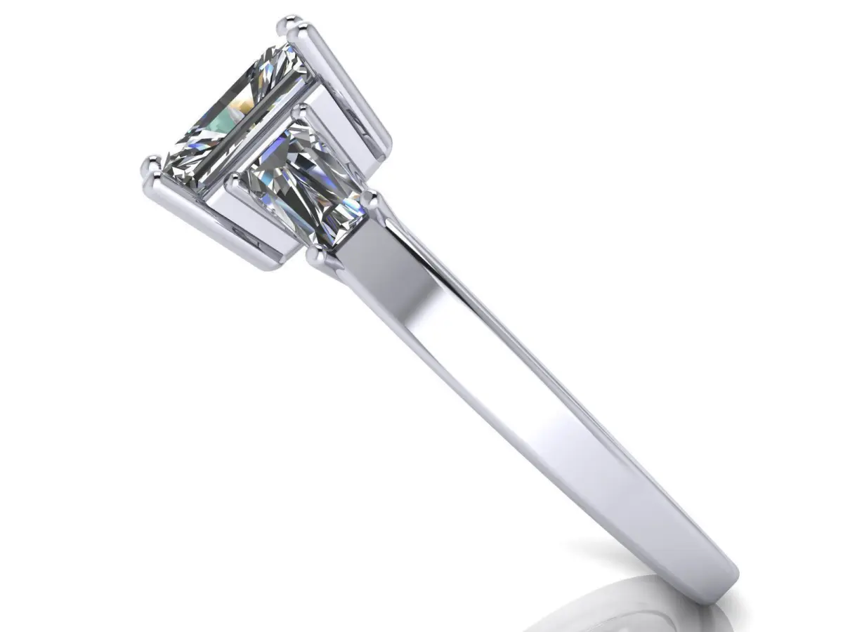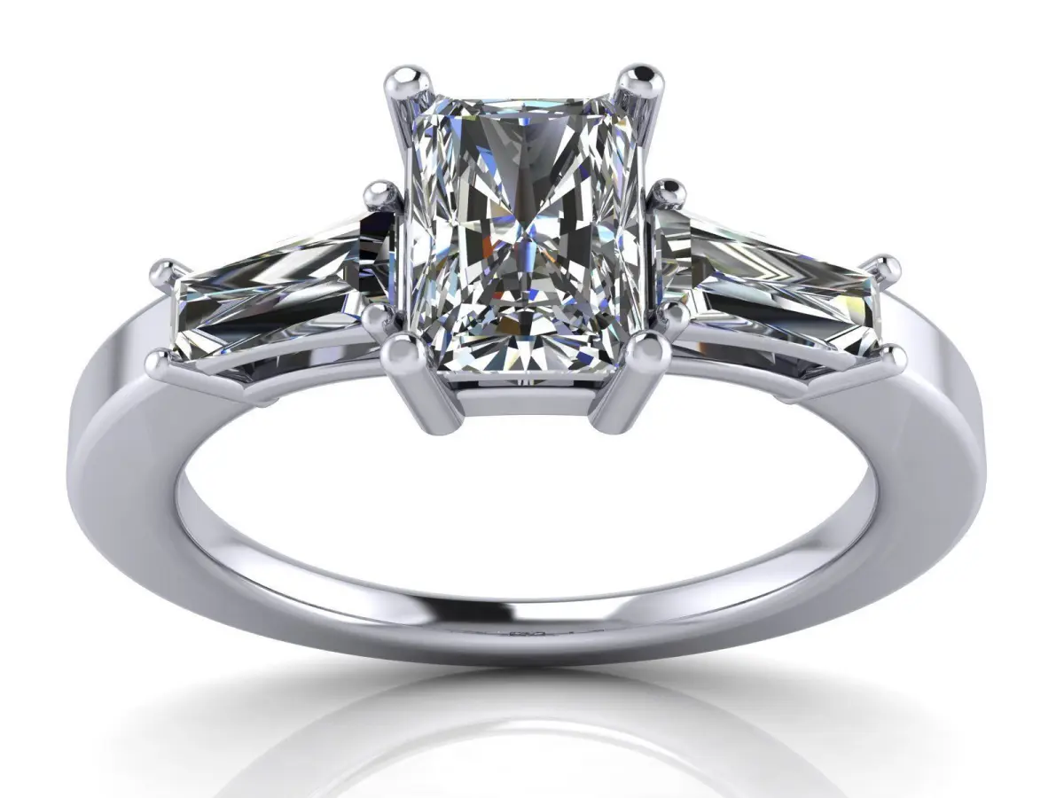 Center Diamond variations: Emerald Cut - 5 x 3mm - 6 x 4mm - 7 x 5mm - 8 x 6mmSide Stones - Tapered Baguettes (sizes varying proportionally with the center stone)