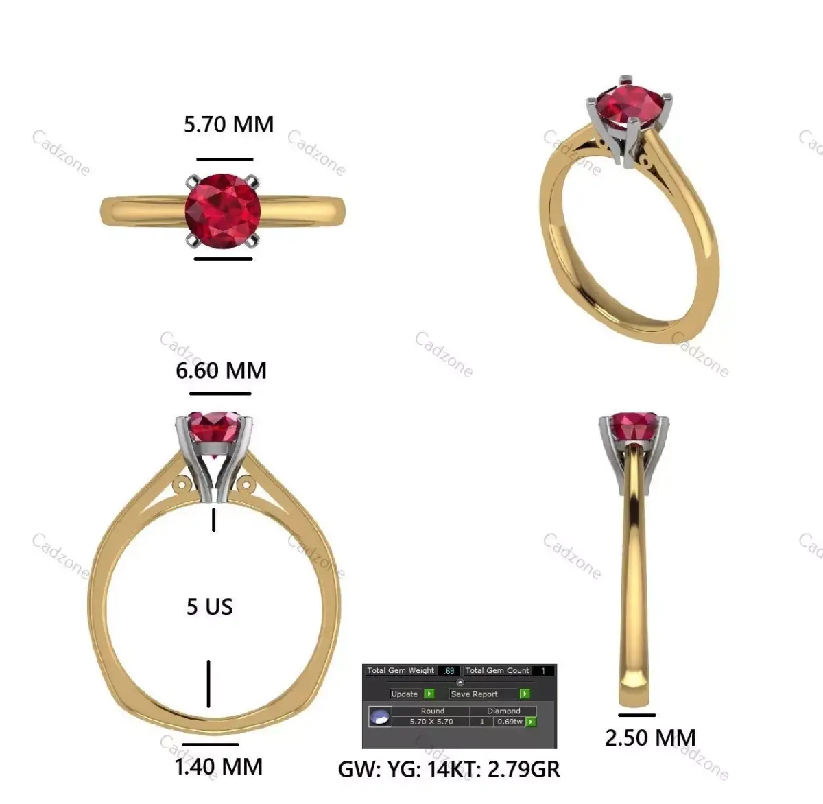 Specifications:Ring Size: US 5Top Width (Gemstone): 5.70 mmGemstone Dimensions: 5.70 × 5.70 mm (Round Brilliant Cut)Shank Thickness (Bottom): 1.40 mmShank Width (Shoulder): 2.50 mmHeight (Profile): 6.60 mm (finger-to-stone height)Material: 14KT Yellow Gold with White Metal Prong Head (modifiable on request)Gross Weight: Approx. 2.79 gramsGemstone Count: 1 round gemstoneTotal Gem Weight: ~0.69 ct
