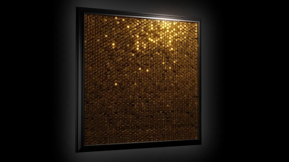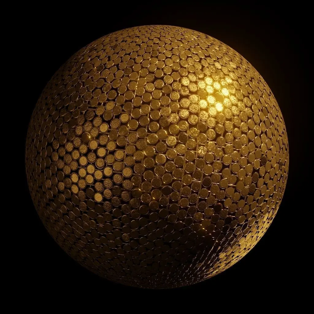 This seamless, hand-crafted Solomon's Wall 4K material is in a novel arrangement, in that the slightly random angling of each coin, combined with the shininess/specularity of the metallic PBR, does an excellent job naturally hiding the seams behind beautifully-randomized glints of golden light. The normal map is the real key behind this effect. This material is great for accent pieces for interior renders or fantasy environments.