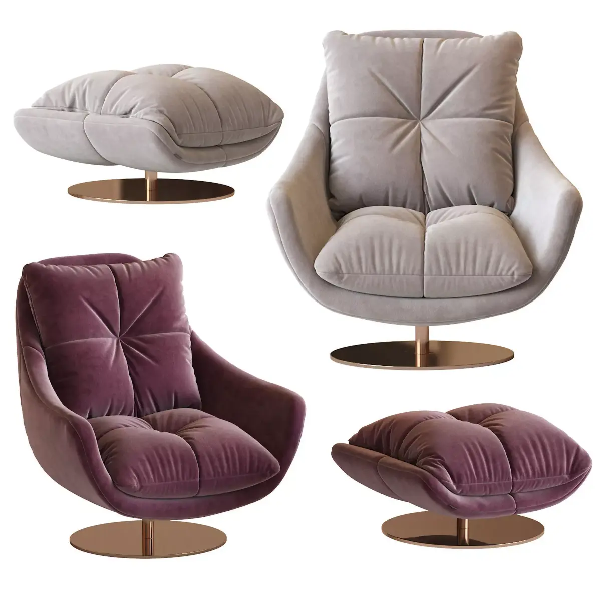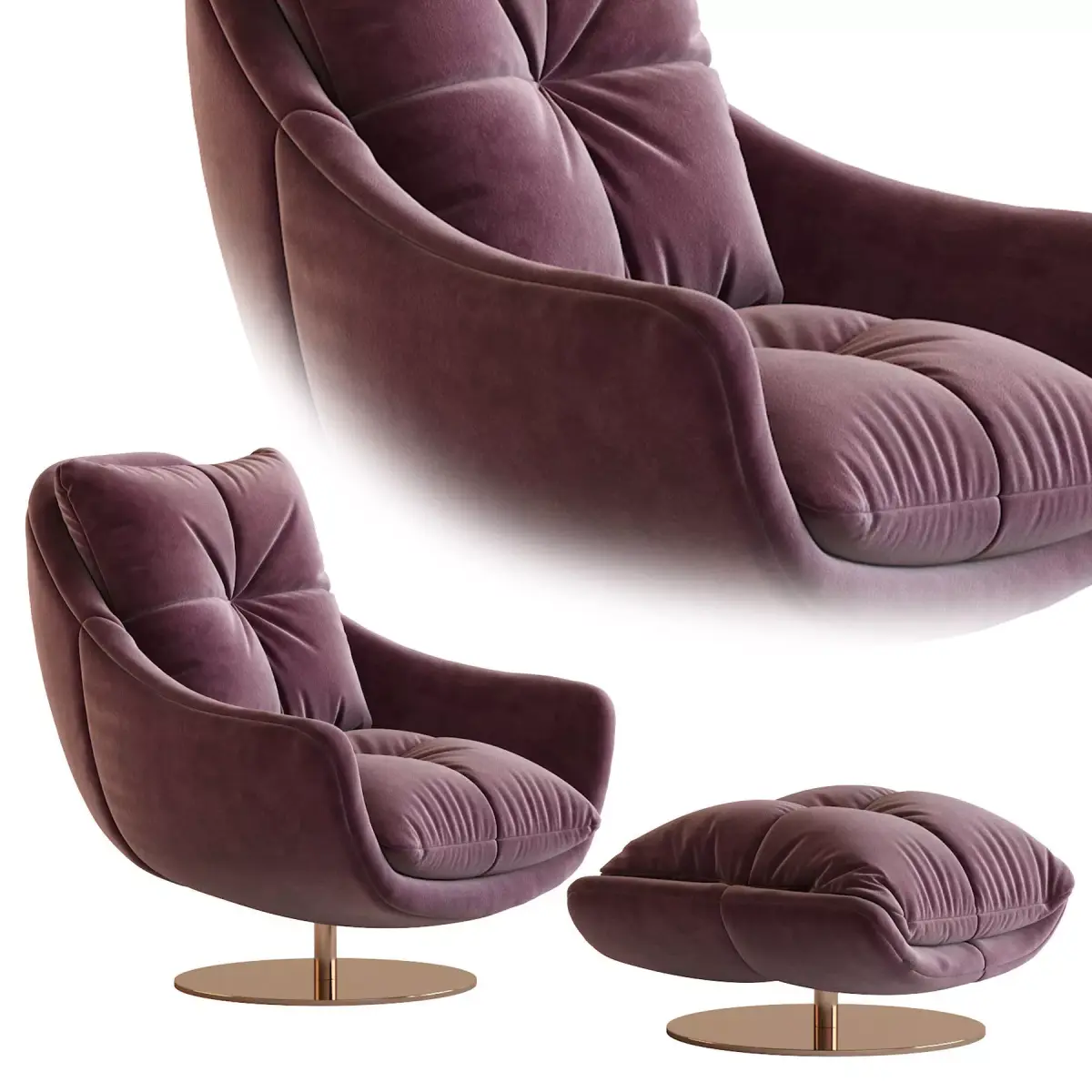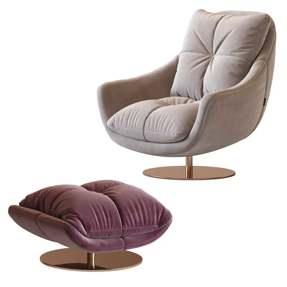 Sophia armchair is also a lounge chair with a curvy and shimmering ottoman. Practical and comfortable, this seating piece features a gold metallic base that can swivel 360 degrees and a fully upholstered body in classy velvet. Sophia is an easy way of adding a splash of style and colour to your living room.