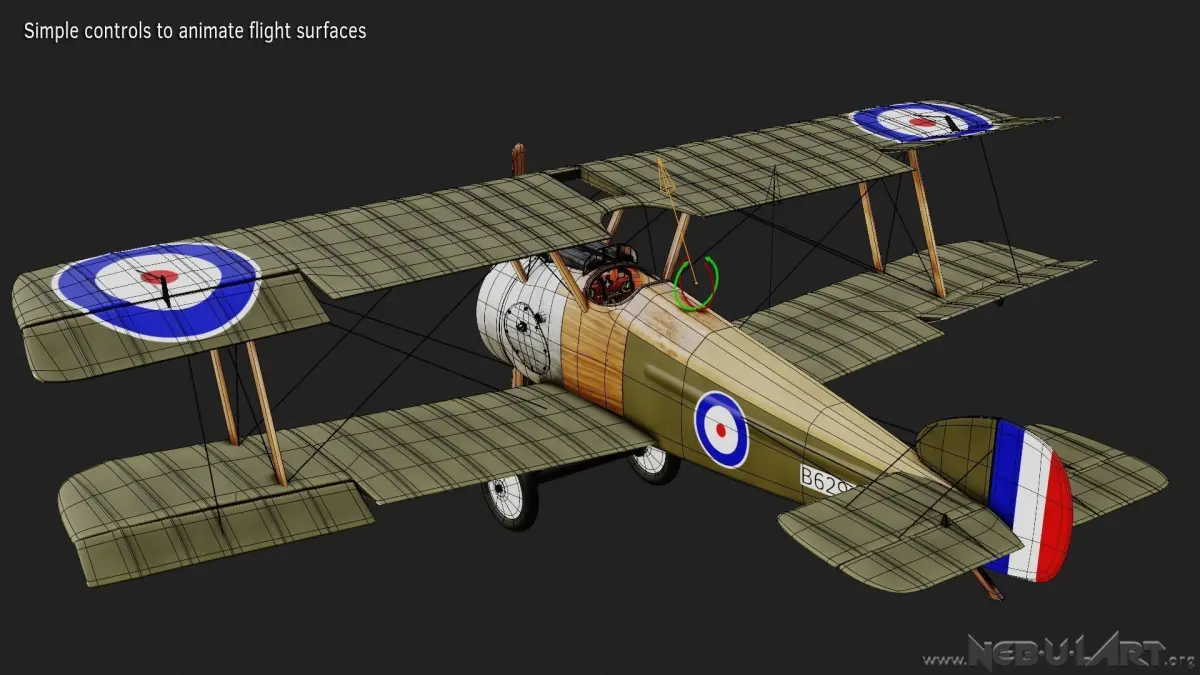 The model comes with rigged flight control surfaces - a single control adjusts the wing flaps while a second control adjusts the tail flaps and rudder (see the video preview for a demonstration). The propeller and wheels can also be animated easily.