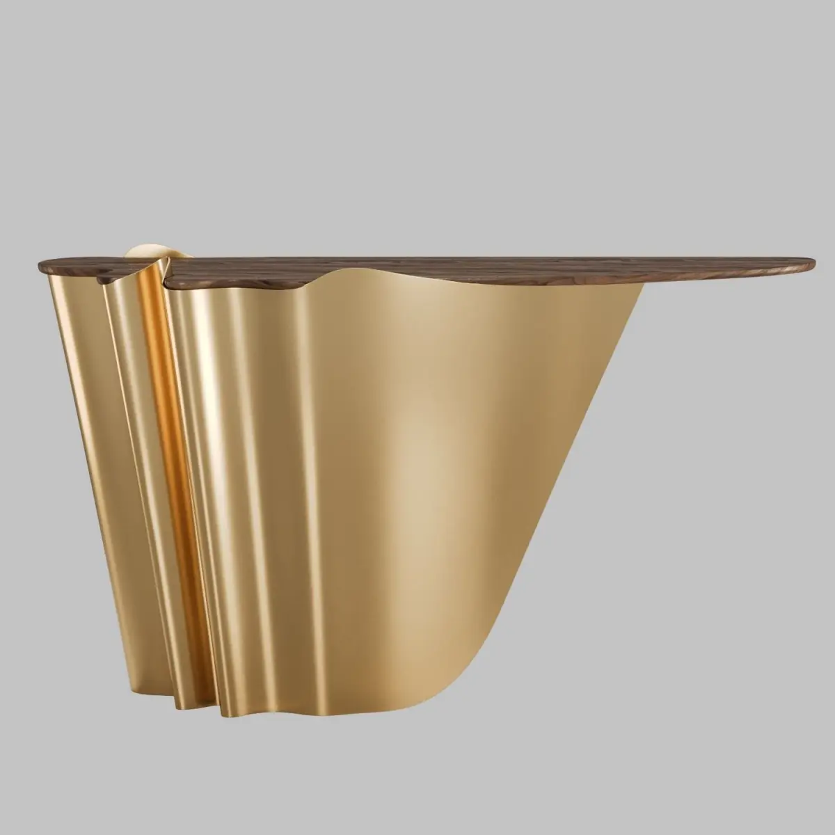 We can feel the rippling of the dunes in the Sossusvlei console giving her shapes that create a cosmopolitan luxury environment. This console is produced in the highest quality materials as the metal effect with nickel, brass or copper finish in the base, and walnut solid wood and veneer in the top.Table top in walnut solid wood and veneer with semi gloss finish. Base in Polished Brass.https://www.almadeluce.com/product/consoles-sossusvlei/ by Alma de Luce