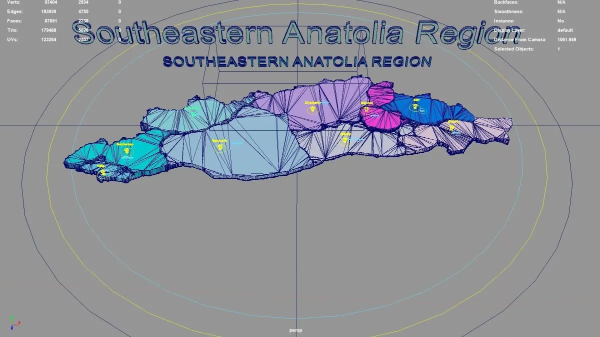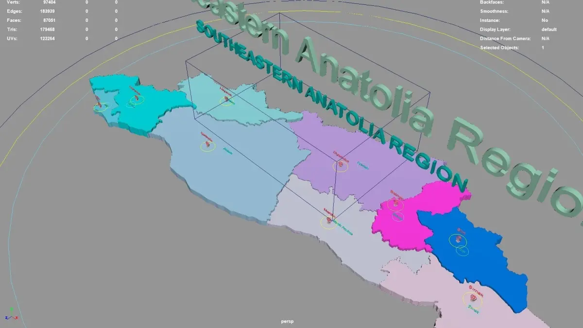 Southeastern Anatolia Region regions : The model is divided according to the administrative region of Southeastern Anatolia Region. Each region is clearly separated so you can easily isolate it or change the colors. Names are also editable and separate.