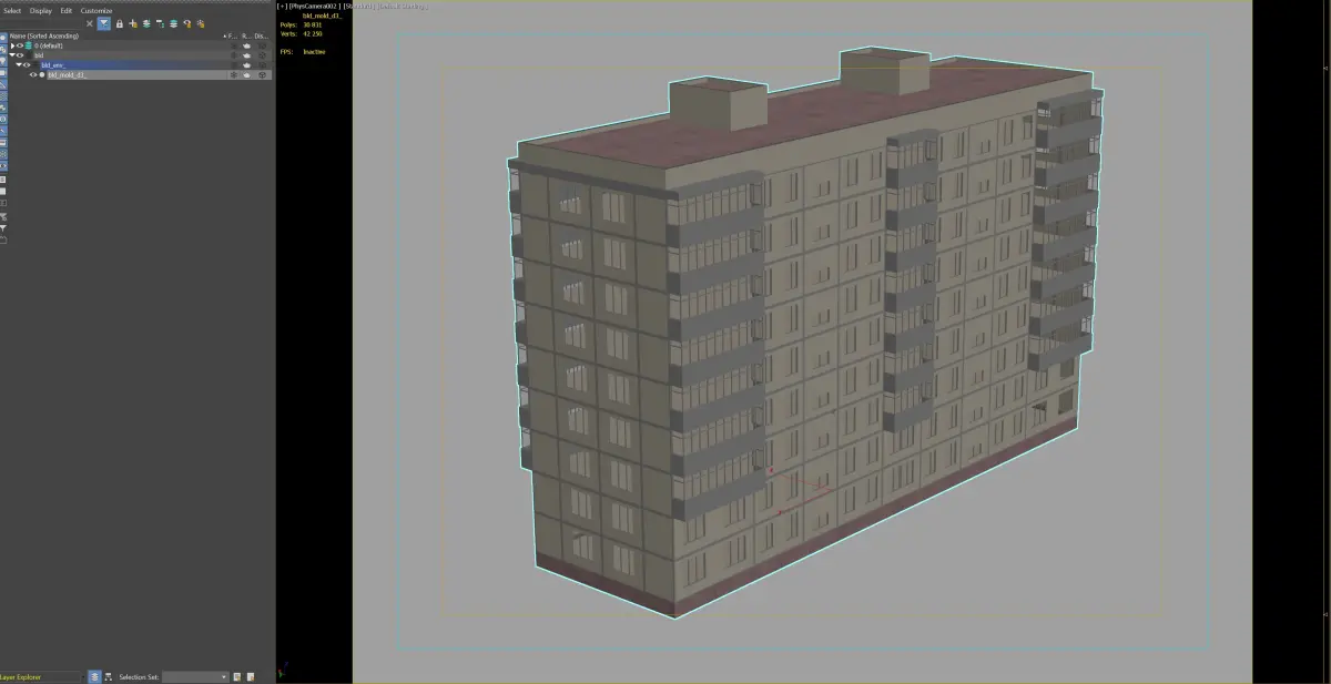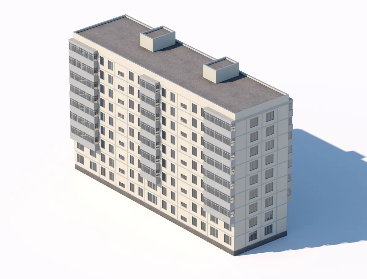 A detailed 3D model of a Soviet-style apartment building featuring multiple floors and enclosed balconies, suitable for urban visualizations.