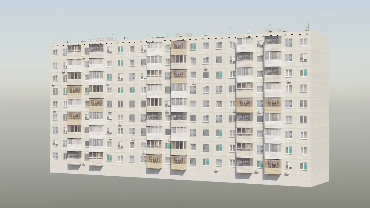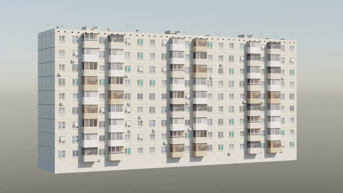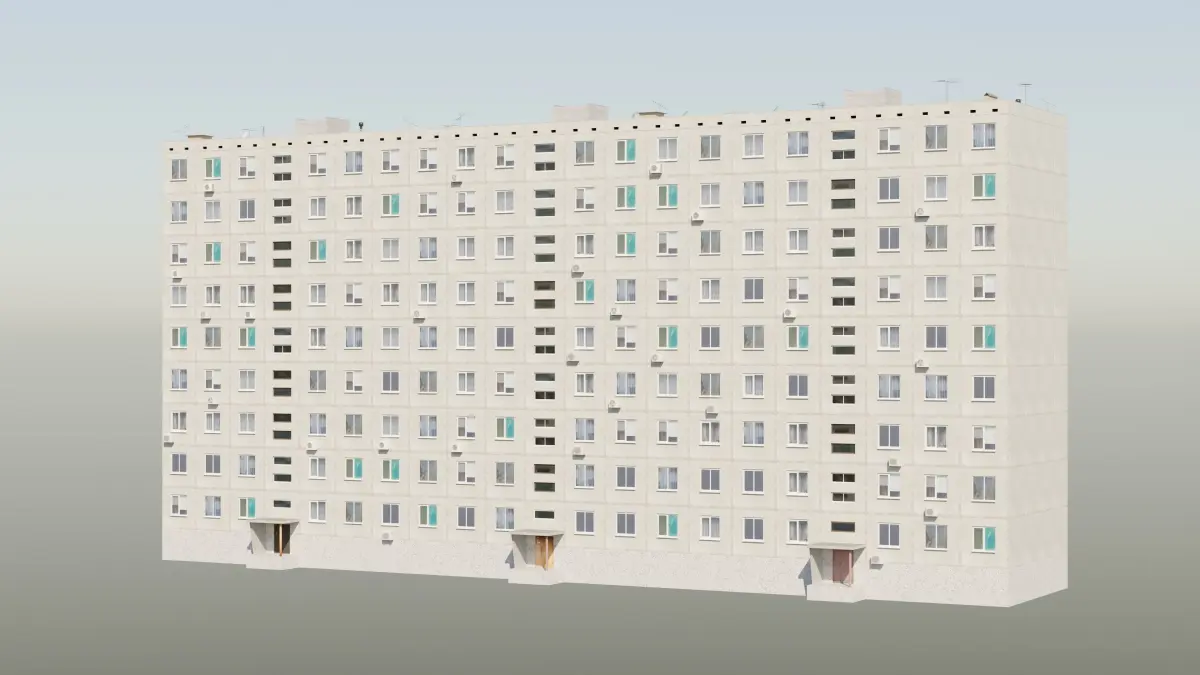 Realistic high quality low-poly game ready 3D model of an old nine-story soviet panel apartment building aka Plattenbau aka Hruschevka with three entrances.