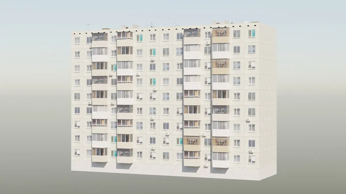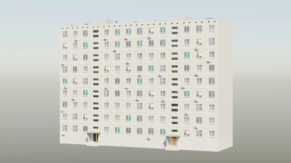 Realistic high quality low-poly game ready 3D model of an old nine-story soviet panel apartment building aka Plattenbau aka Hruschevka with two entrances.