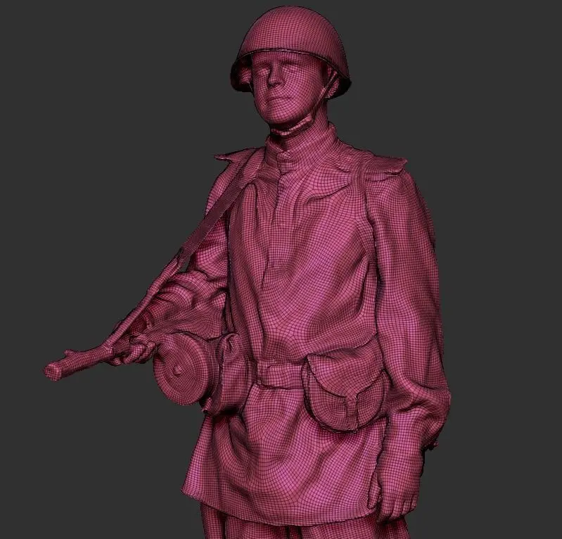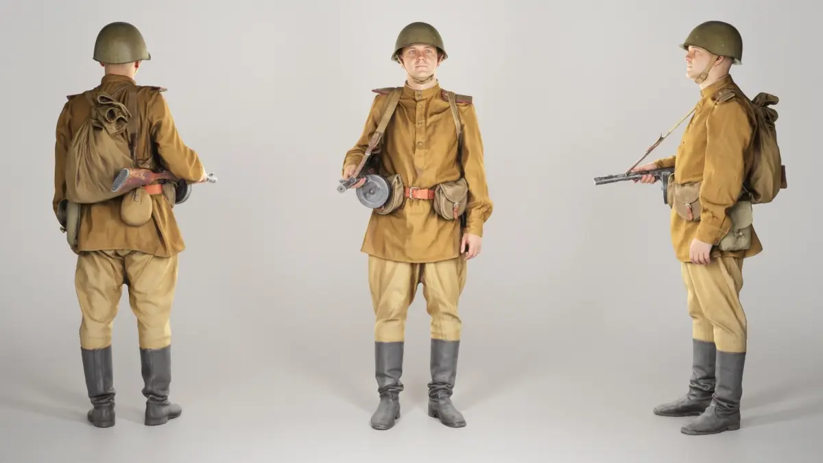 This is a true human size and detailed model of a Soviet private soldier character from WW2. All props and suit are original. The model is captured in casual pose to be perfectly matching to variety of architectural visualization, background character, World War 2 reconstruction, performance, VR/AR content etc.