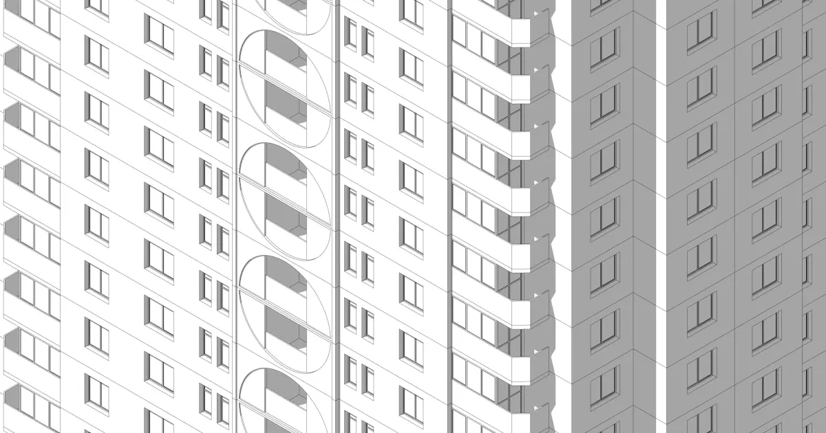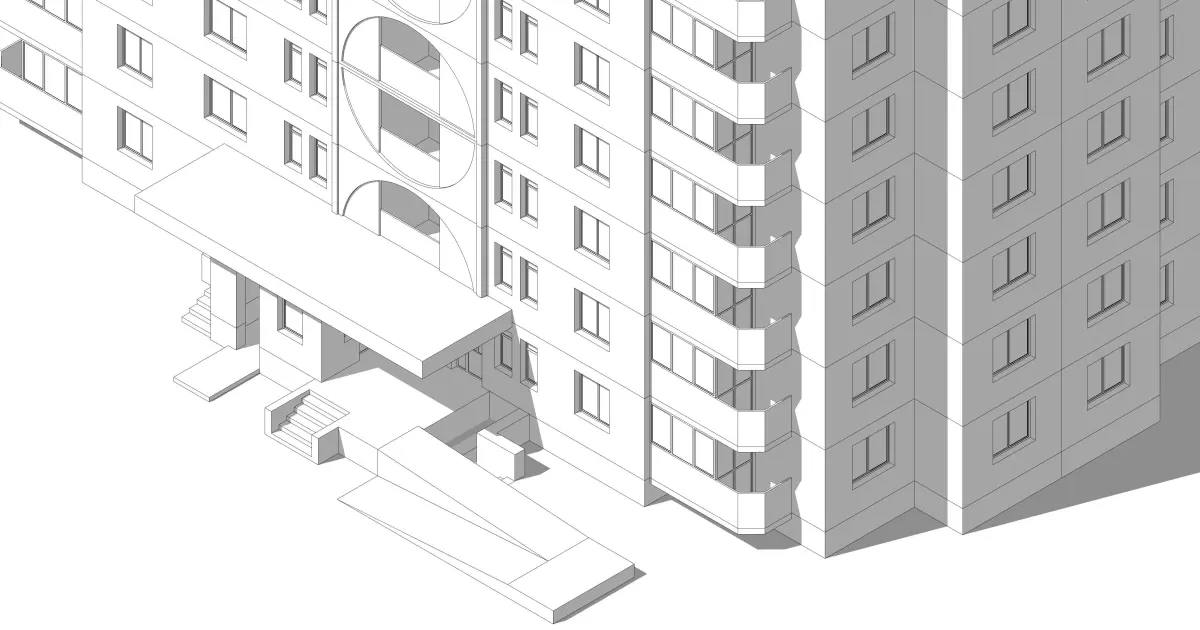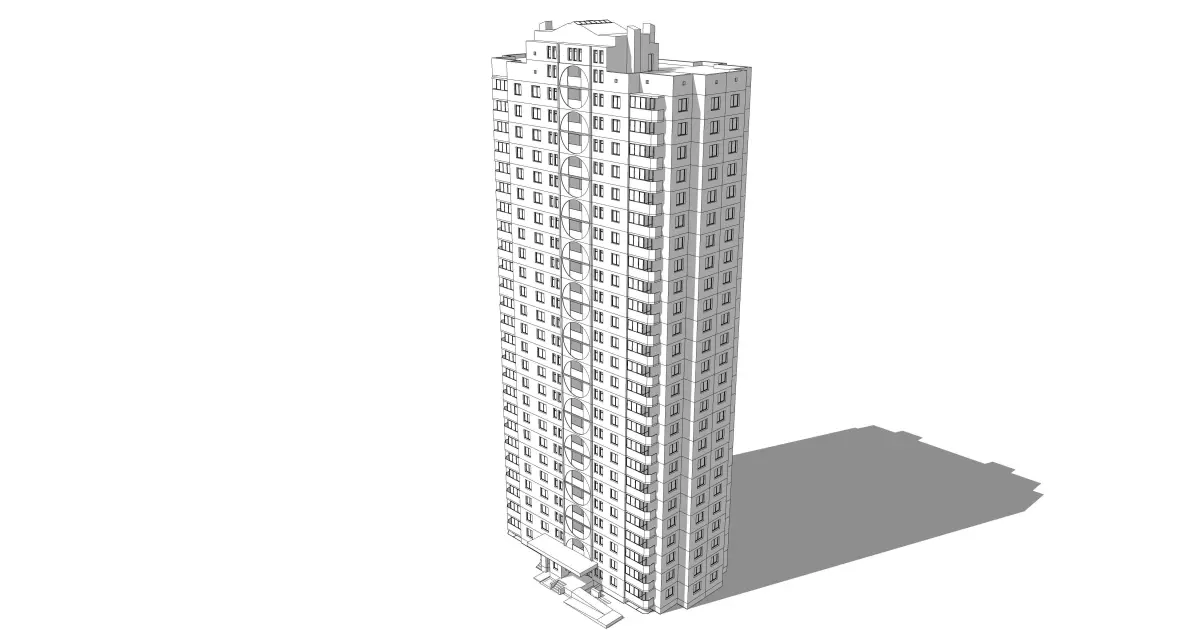 A detailed model of a Soviet mass-produced panel house. The model is made in Sketchup 2019 and includes floor plans. All elements are separated and carefully arranged.